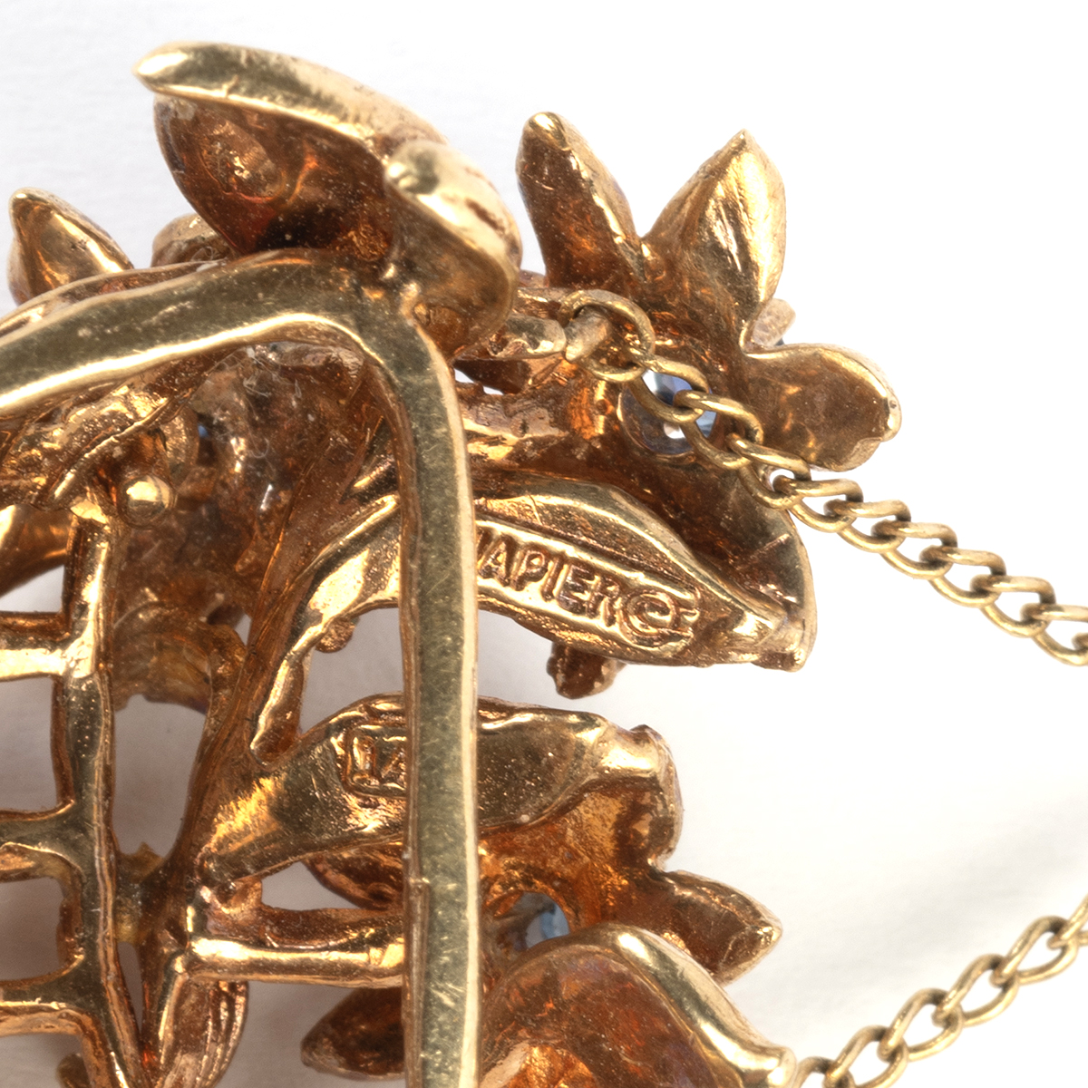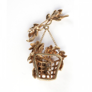 Designed as an articulated basket of flowers, the center flowers featuring three round-cut sapphires, set in a 14k yellow gold mounting measuring approximately 43 x 32 mm.