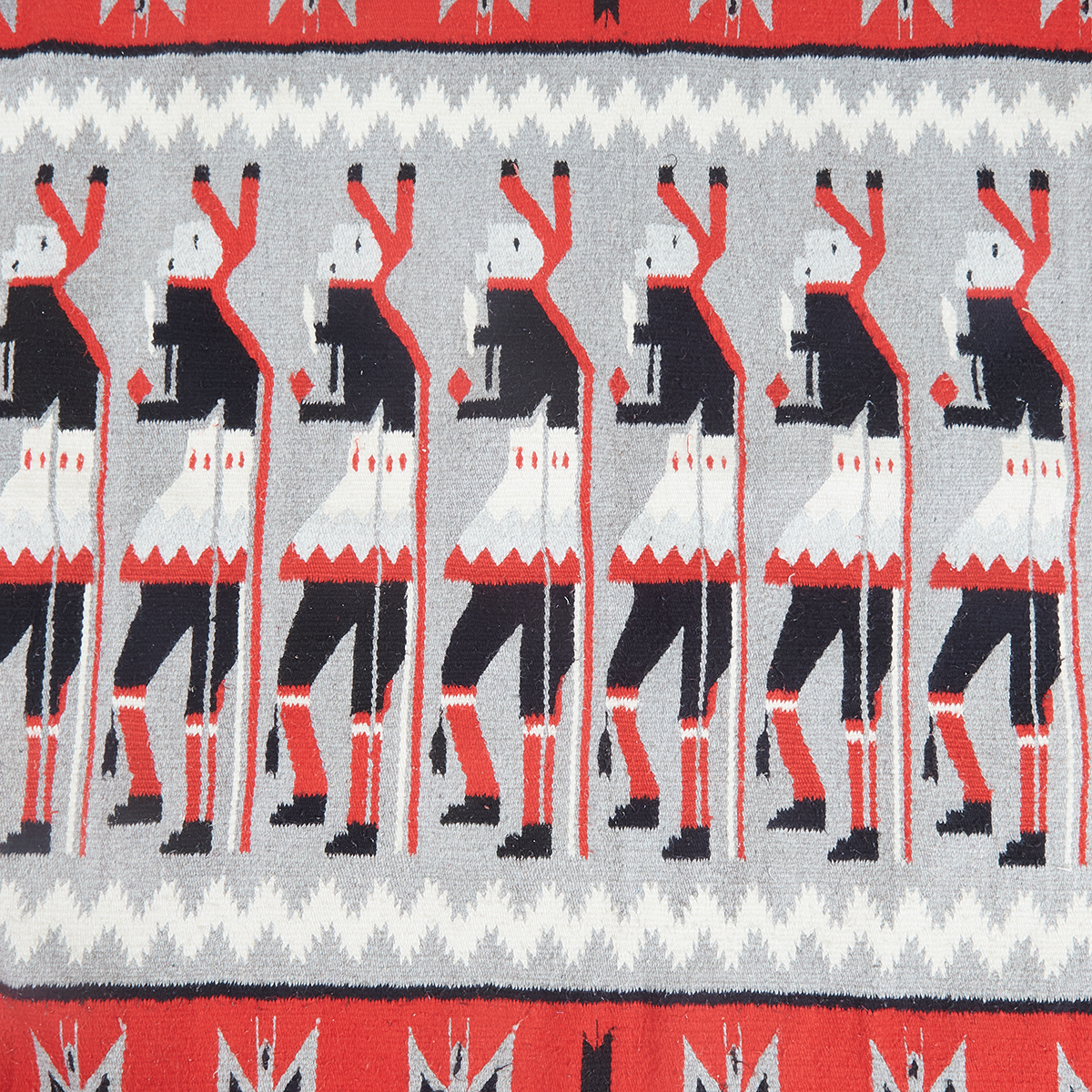 Procession of 12 figures woven in gray, black, white, and red.
