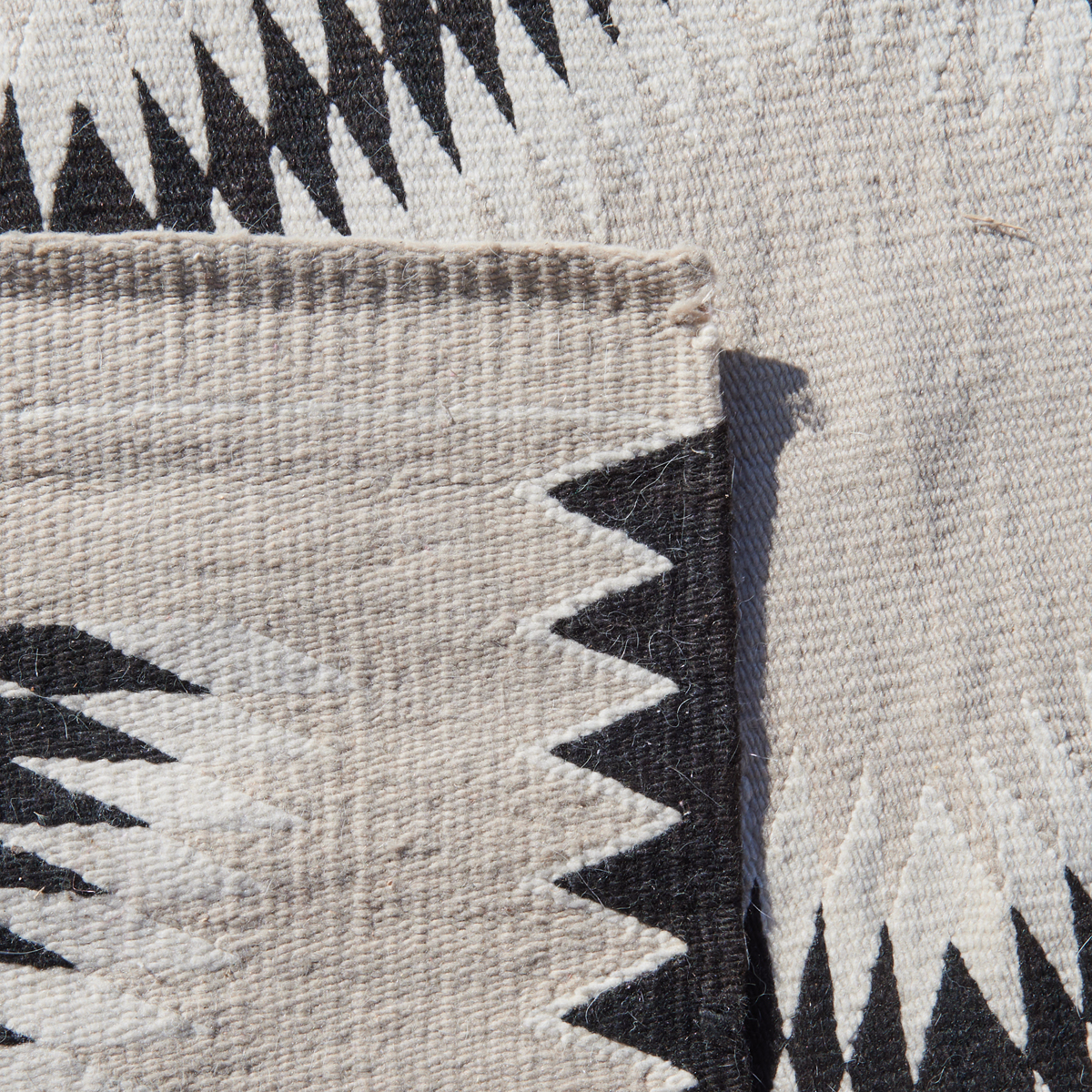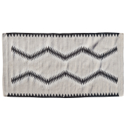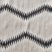 Woven in shades of grey, off white, black, with long vertical bands, and with black to sides.