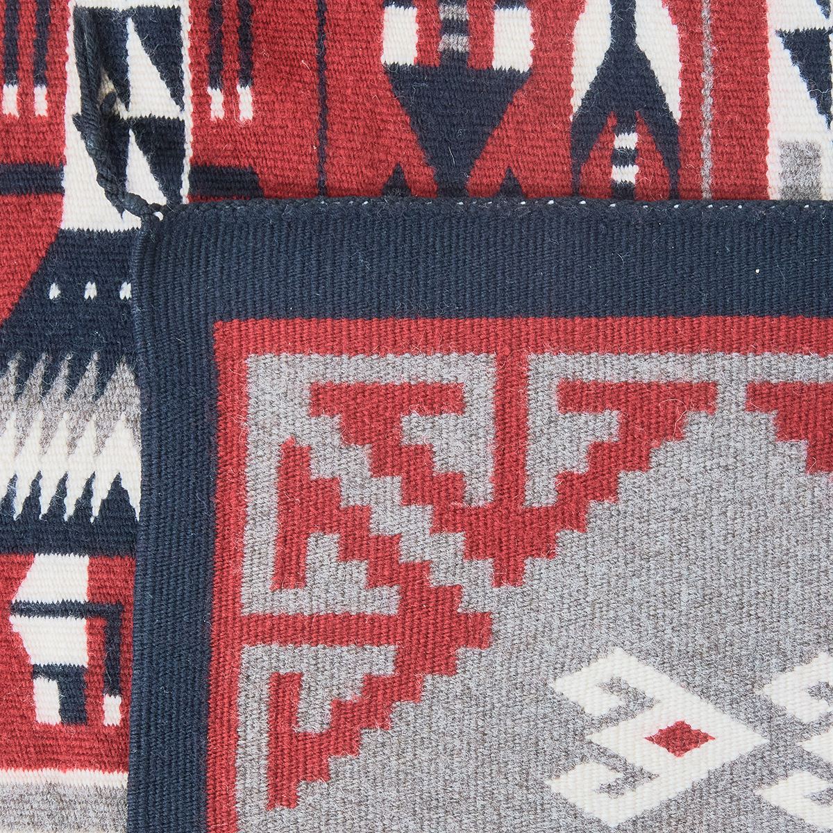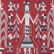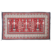 Five large figures amongst corn, six additional smaller figures woven in black, red, gray, blue, white.