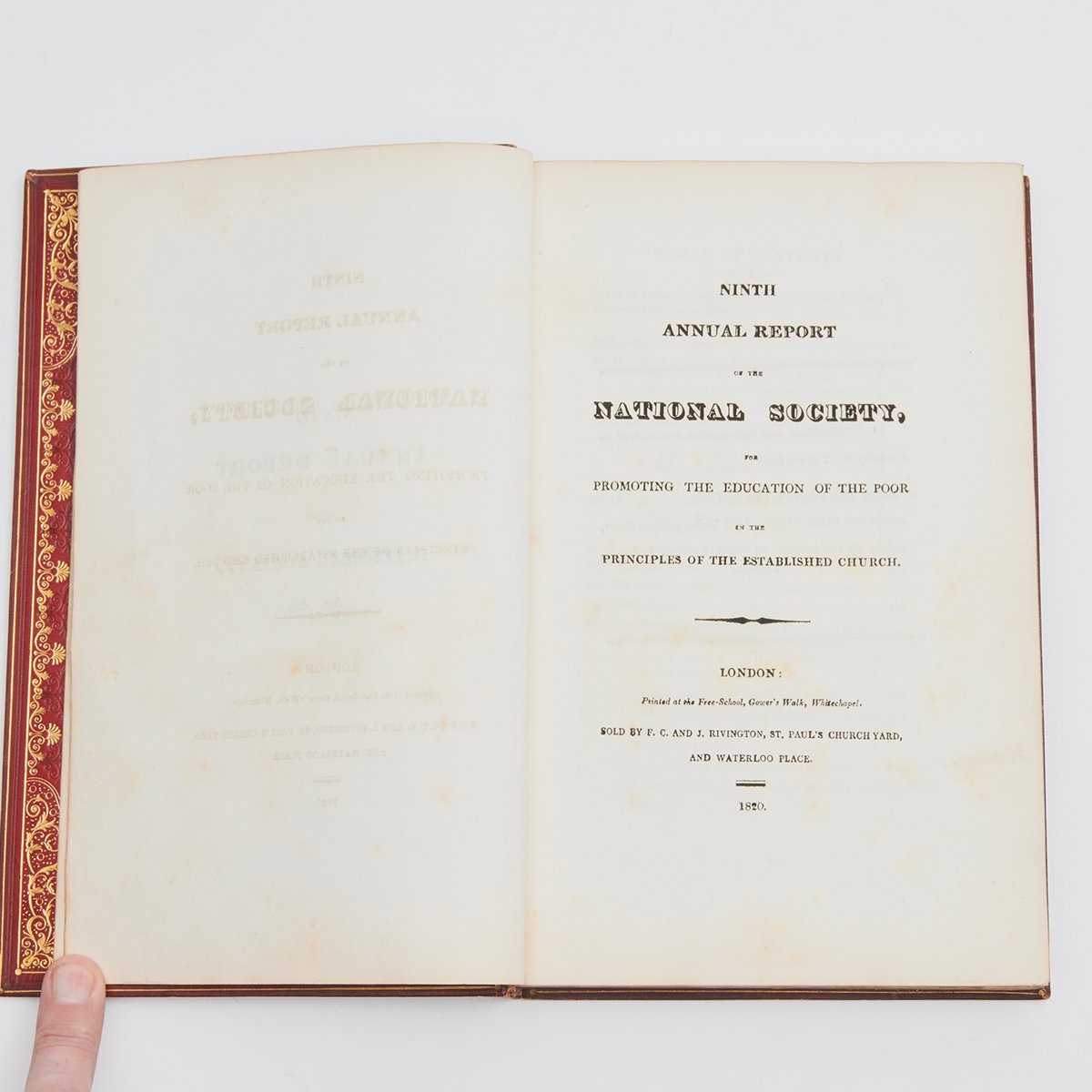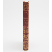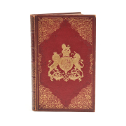 Period red leather gilt tooled hardcover with George IV coat of arms and initials to front and back cover, cover interiors with moire silk panels and additional gilt tooled decoration. Gilt page edges.