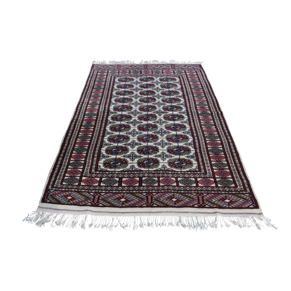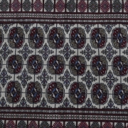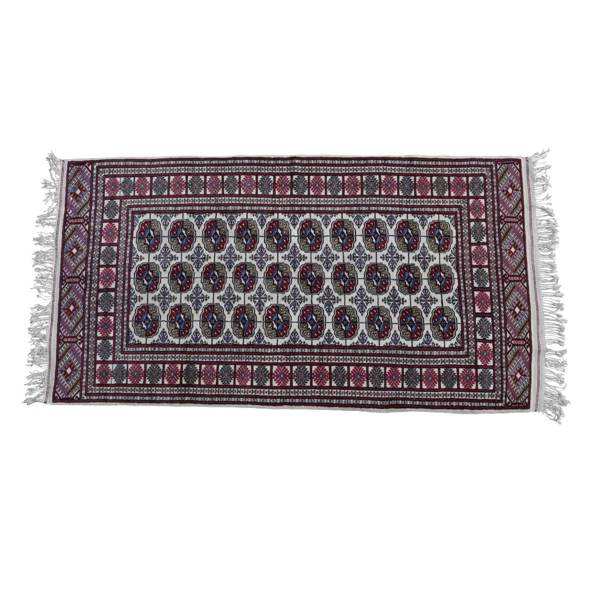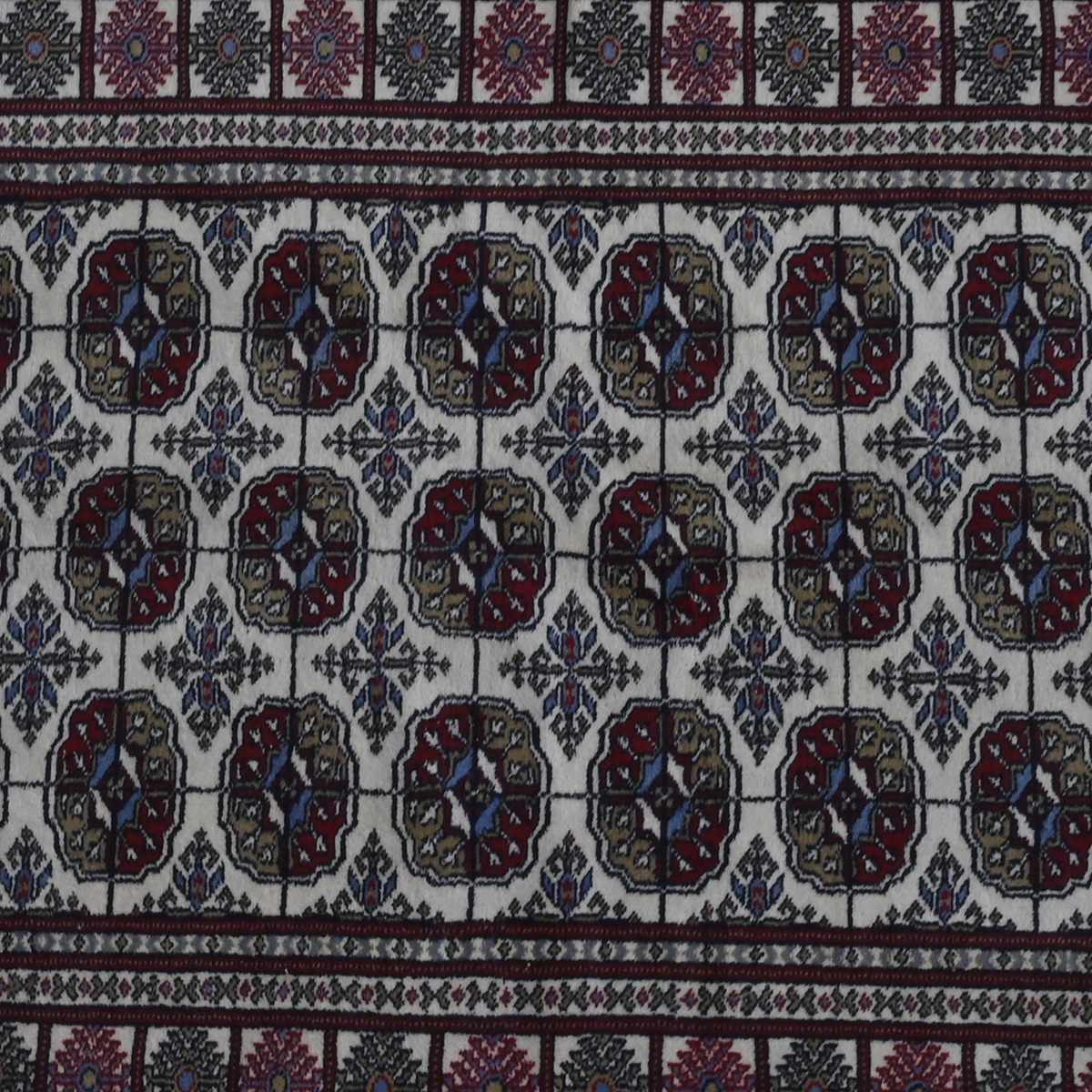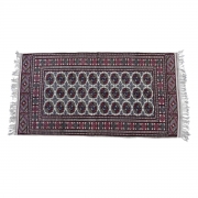 Three rows of 10 medallions each on a cream ground, multi-tiered border the rug executed in light blue, dark blue, red, beige, and cream.