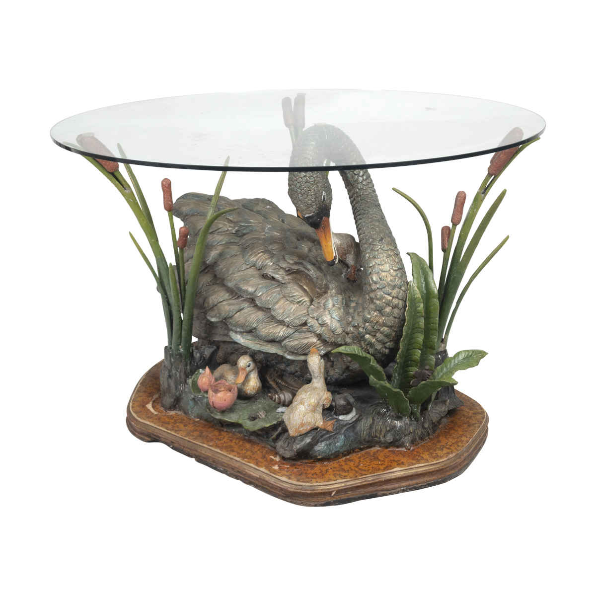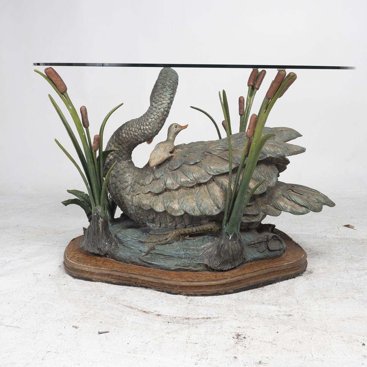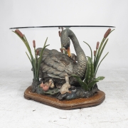 In the form of swan with chicks amongst foliage, on a wood base, round glass top.