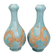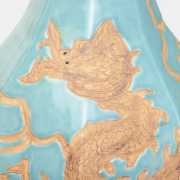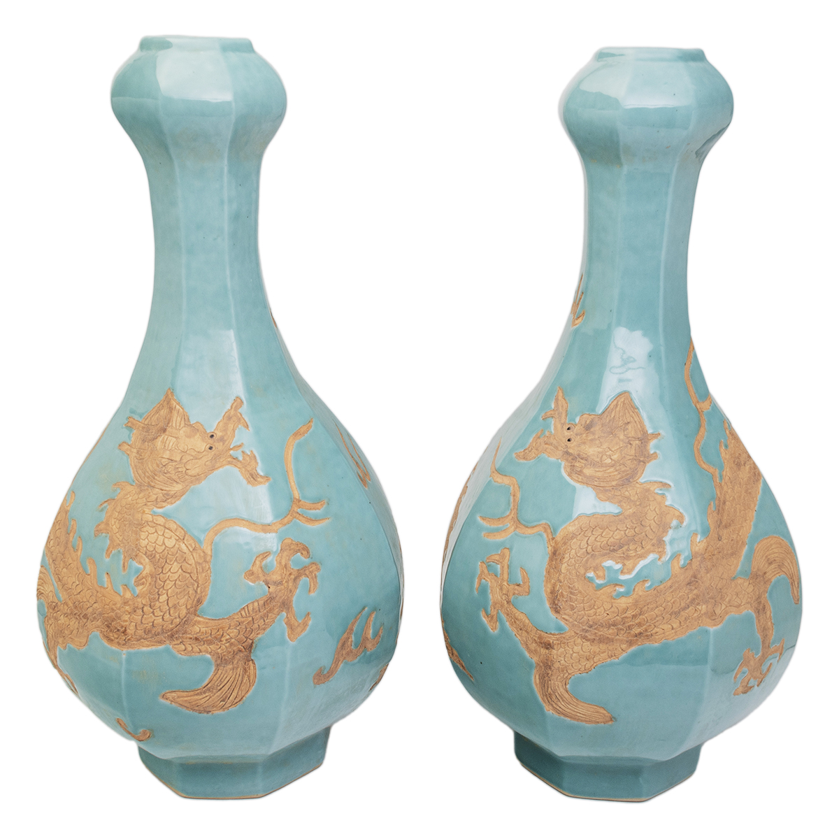Each vase features a globular octagonal body topped with a bulbous neck and a short rim, supported by a robust foot. The body is decorated with an unglazed four-clawed dragon and flames, and is further covered with a pale turquoise blue glaze.