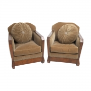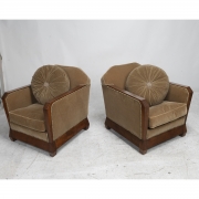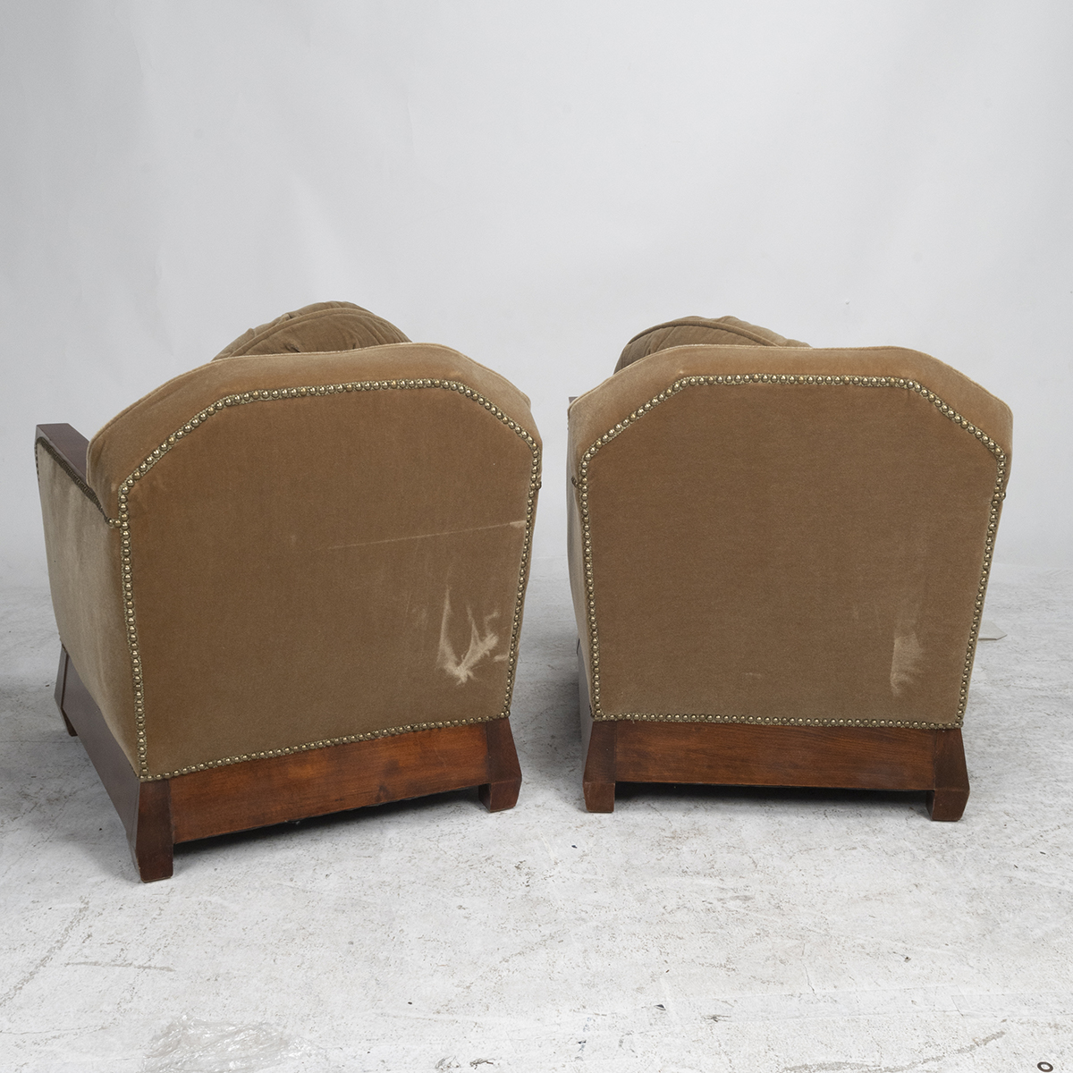 Mahogany frames, riveted green/brown upholstery, tufted round back cushions.