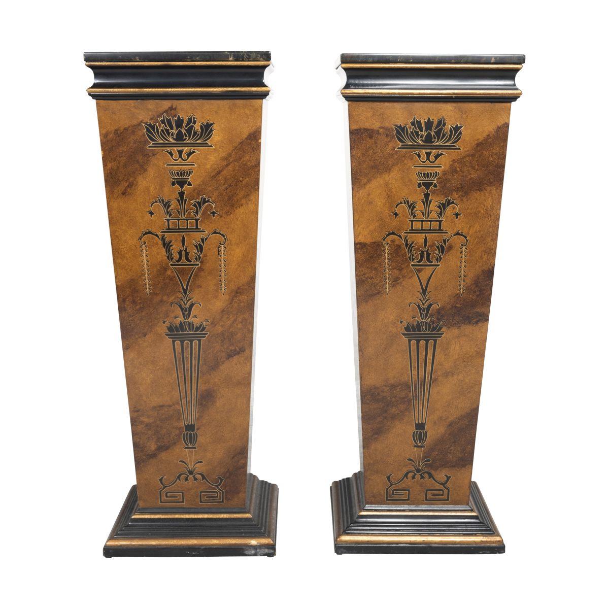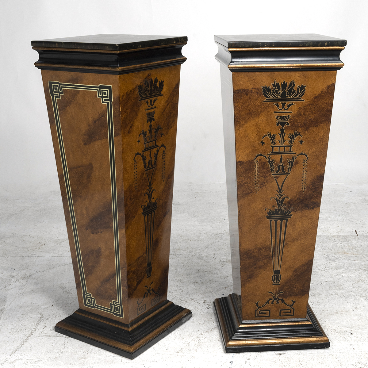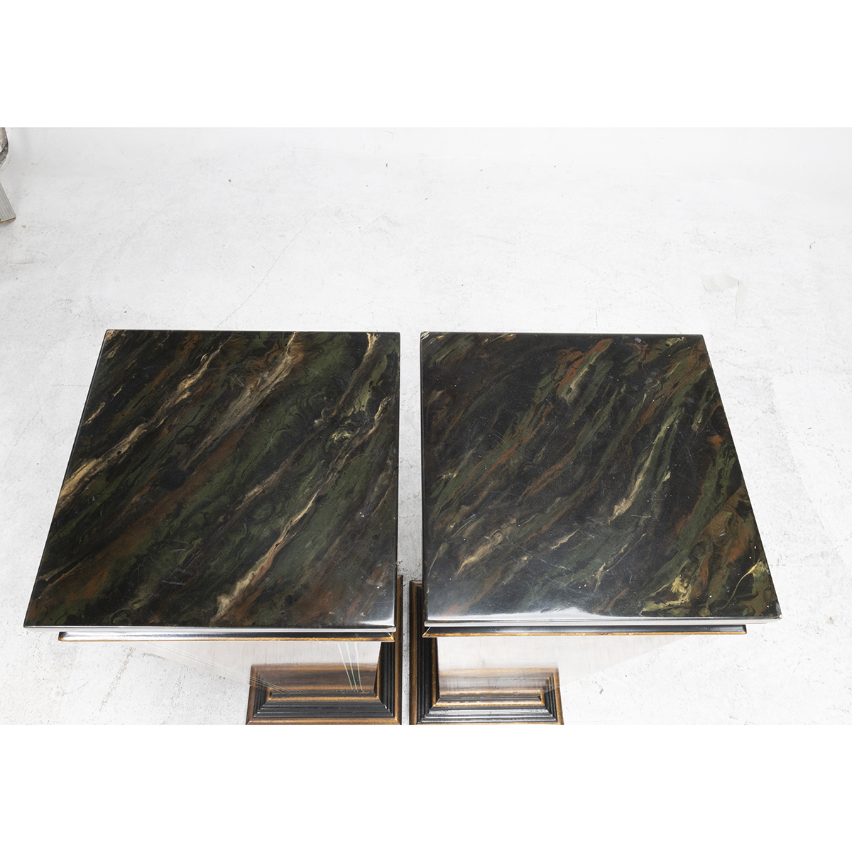 The square marbelized tops on faux bois tapered pedestals with painted inlay style decoration, stepped bases.