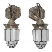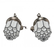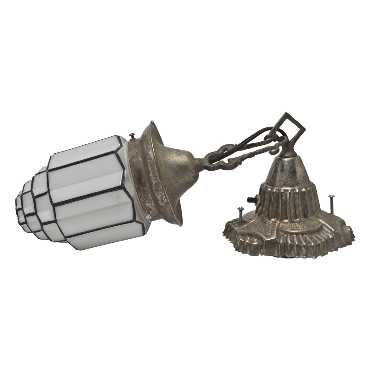Nickel plated bodies, white glass hanging shades with black painted trim.
