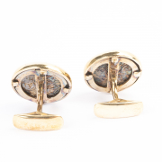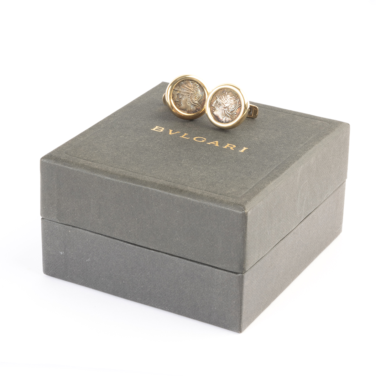 Each featuring one ancient Roman coin, set in an 18k yellow gold mounting measuring approximately 19 mm. Accompanied by original Bulgari boxes.