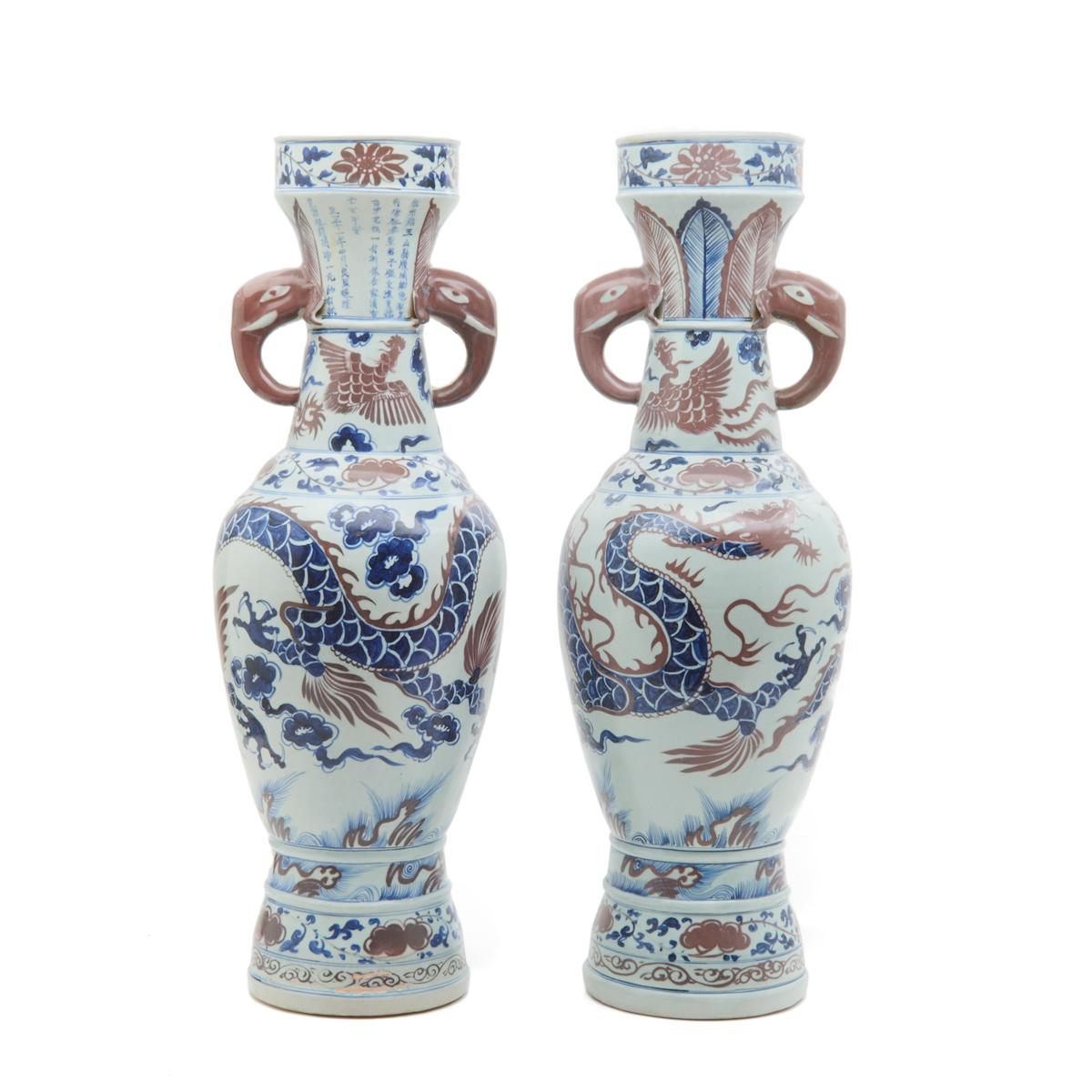 Each of elegant baluster shape rising from a stepped foot to swelling shoulders, surmounted by a waisted neck, painted on a white ground with blue body and a red silhouette of a dragon flying over lucky clouds centered by foliage and floral bands at neck, waist and foot, upper part of neck is decorated with Chinese inscriptions and lappet bands, the lower part of the neck features red glazed phoenixes, applied with red glazed Chilong handles.