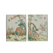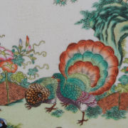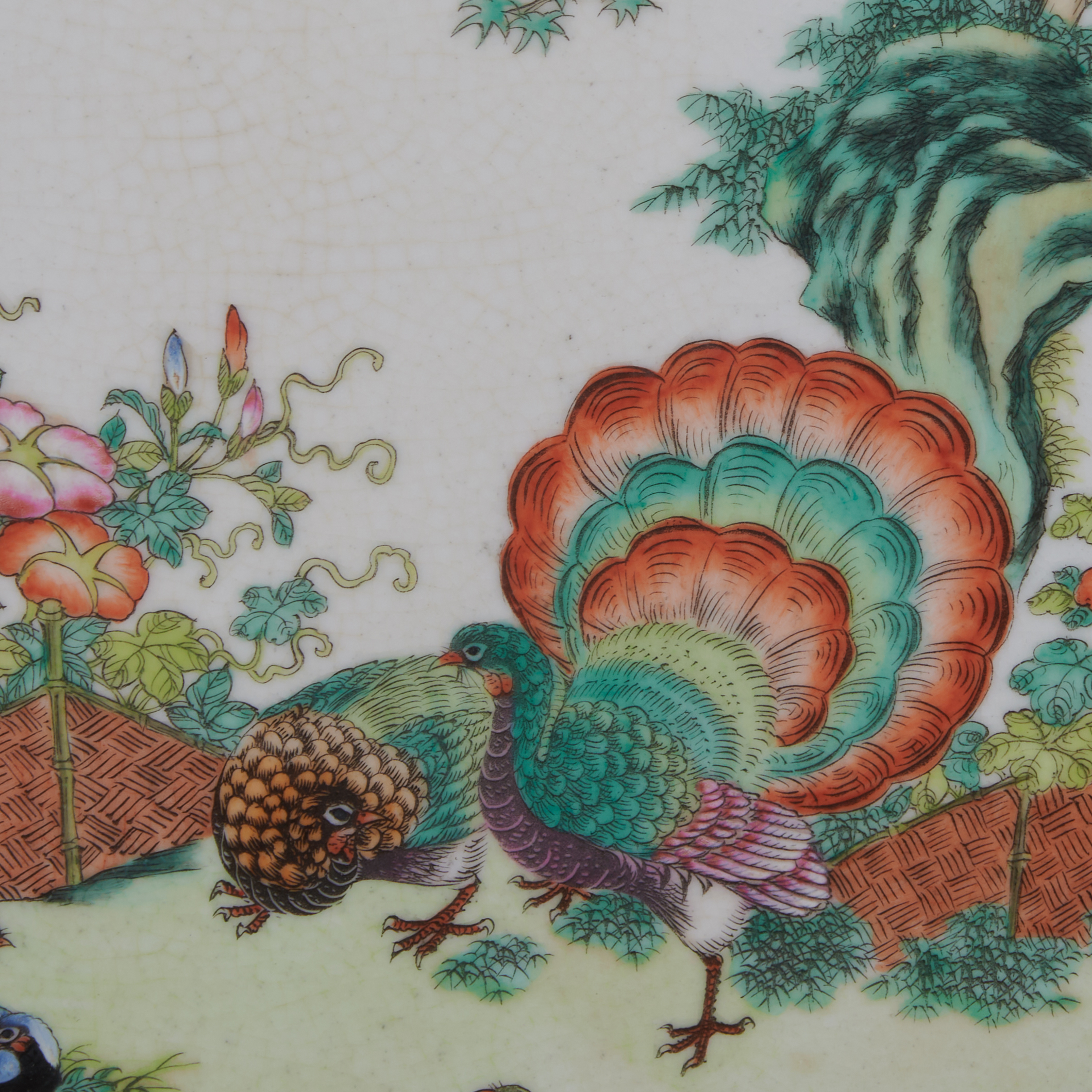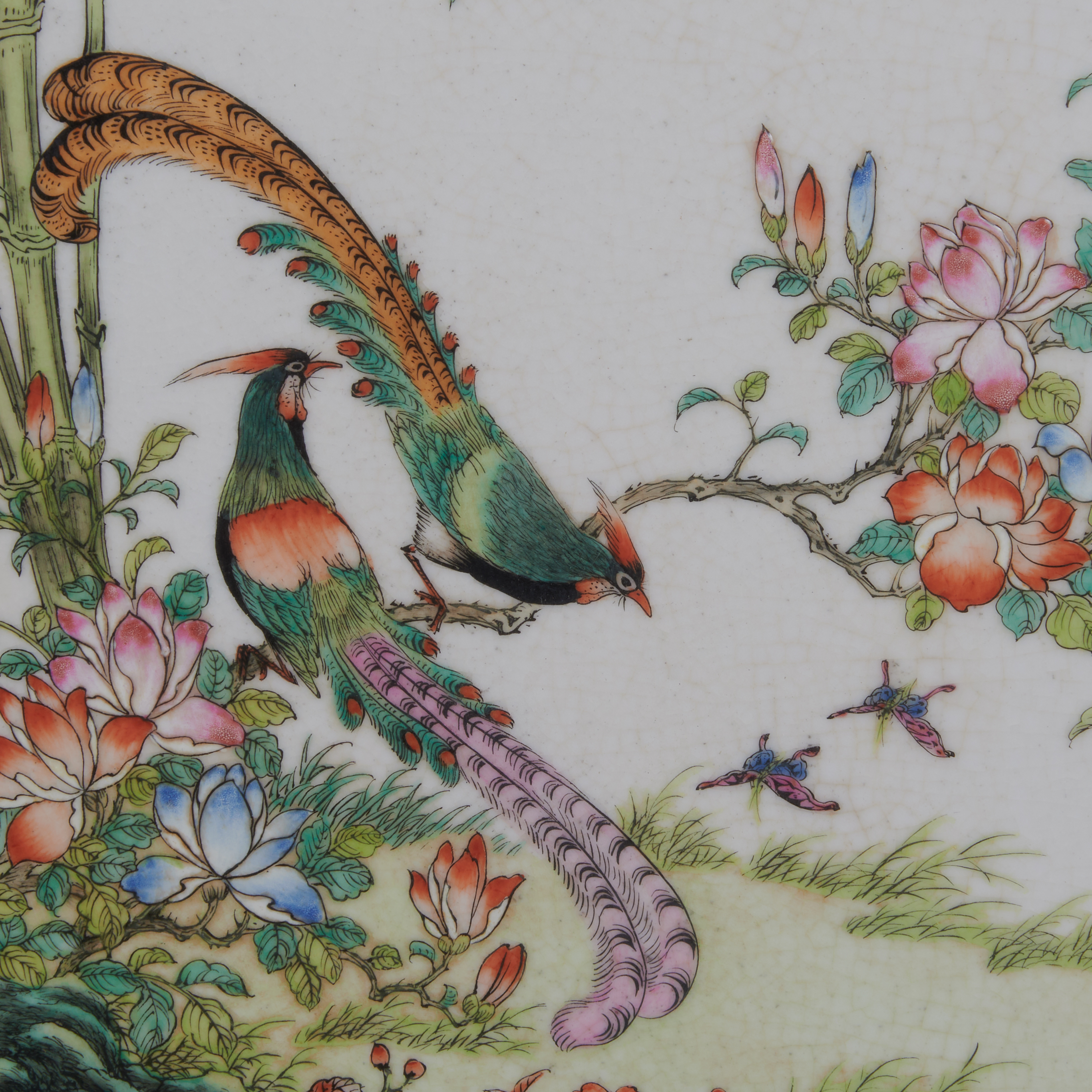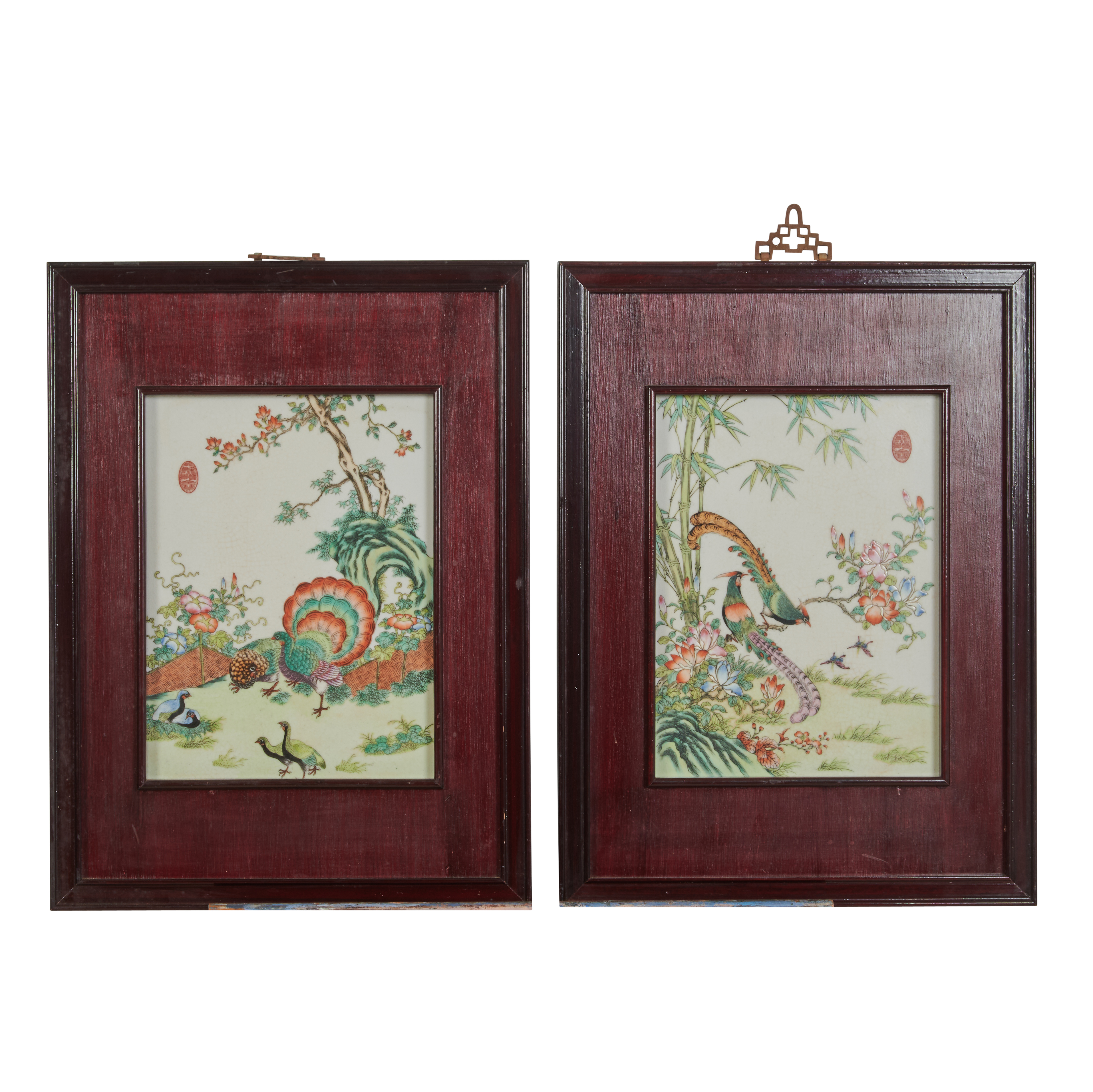 Each panel is of rectangular form, finely painted and enameled, depicting peacocks, long tailed birds, cranes and other colorful birds, flying or walking upon and under flowering trees and bamboo. Each bears an oval apocryphal imperial seal mark, set in a rosewood frame.