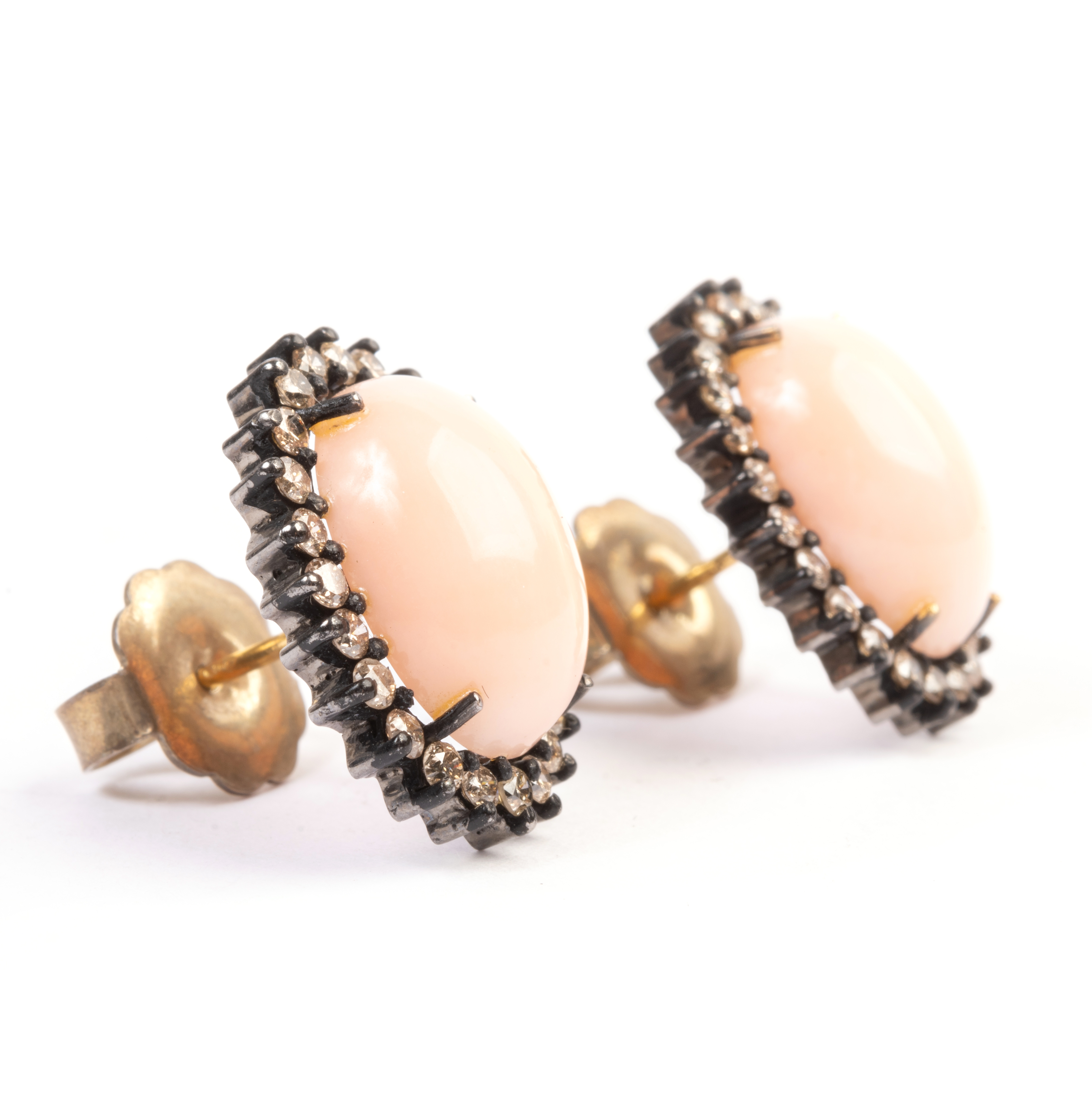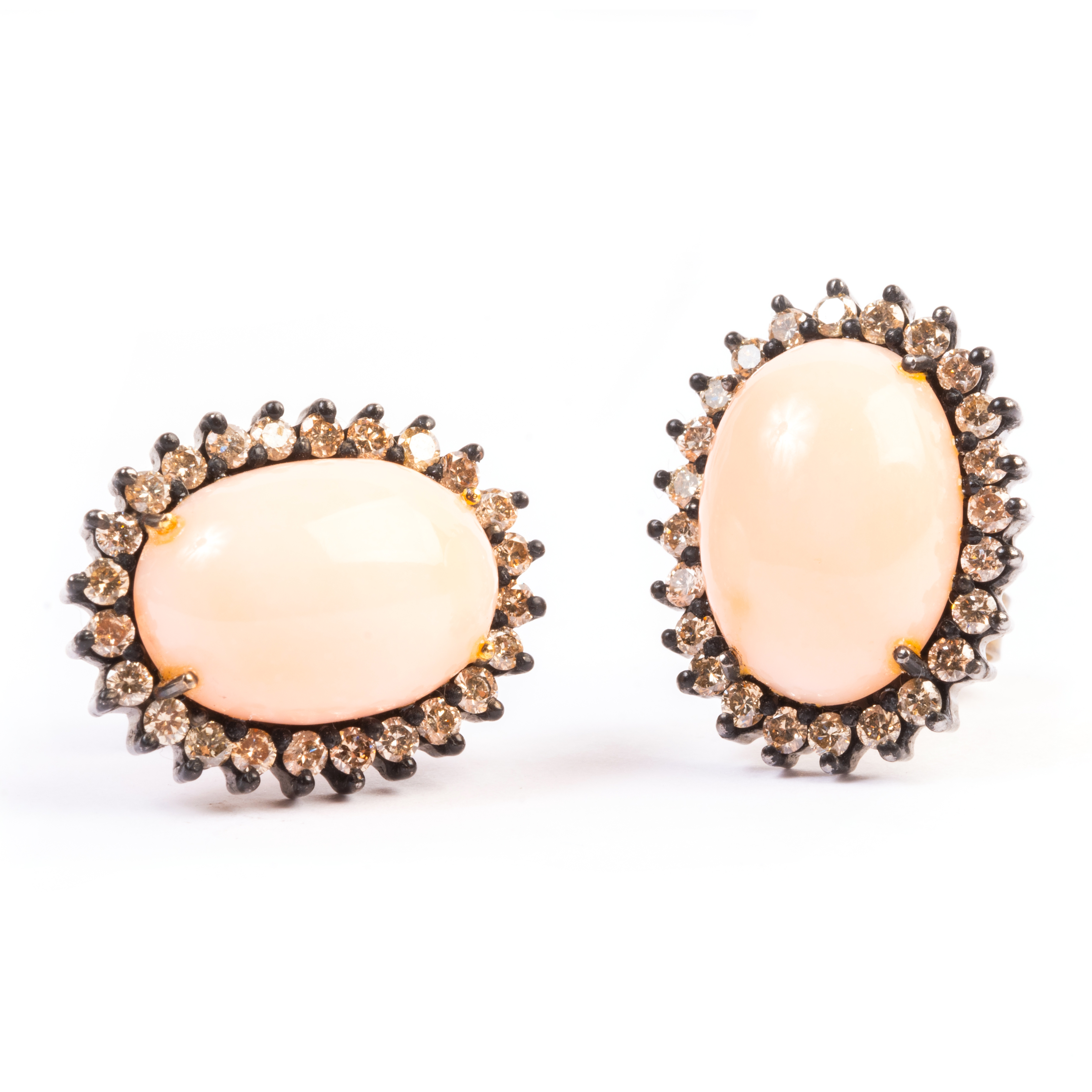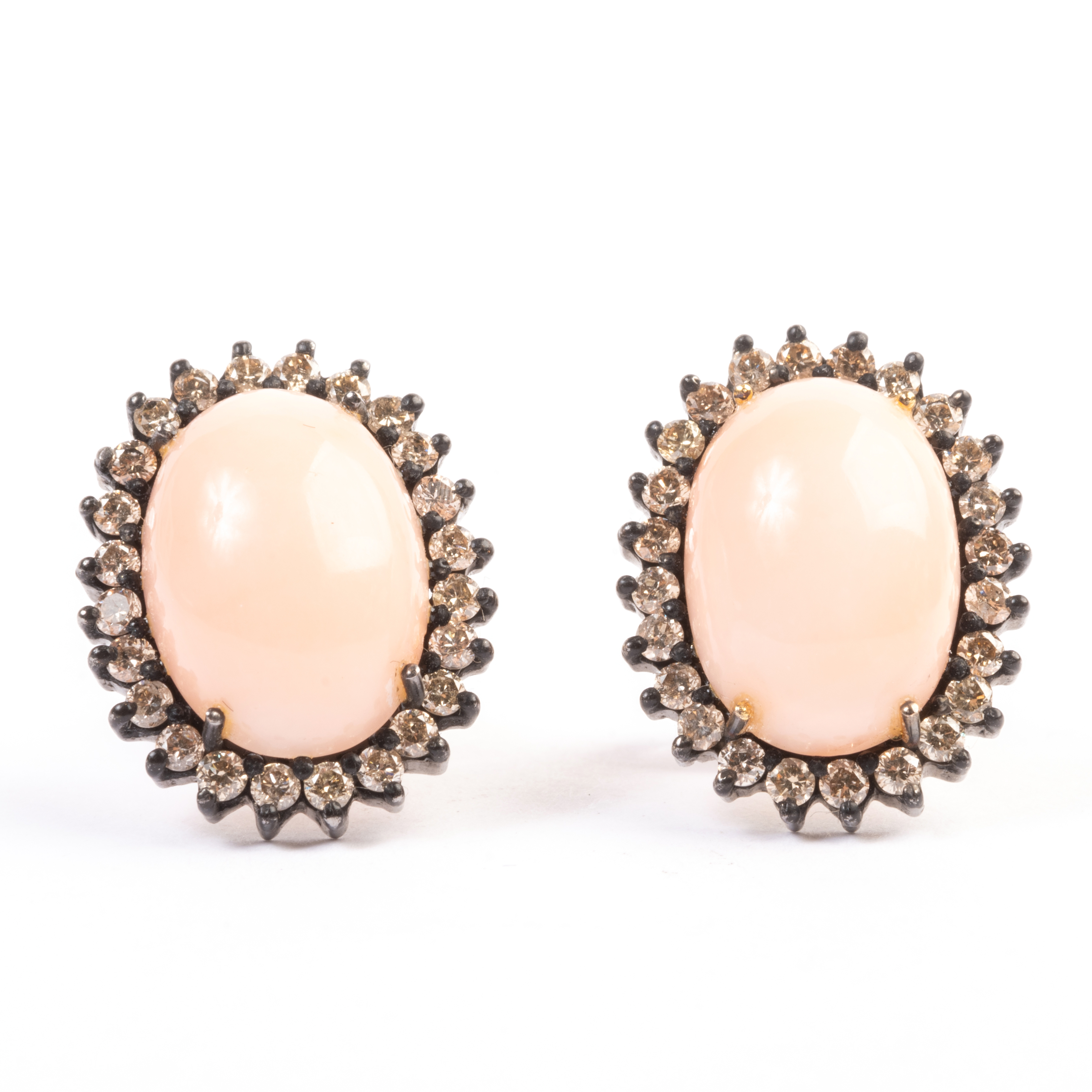 Each featuring one oval shaped coral cabochon measuring approximately 13.9 x 10.2 mm surrounded by full-cut diamonds, set in an oxidized silver mounting, completed by 18k yellow gold posts.