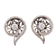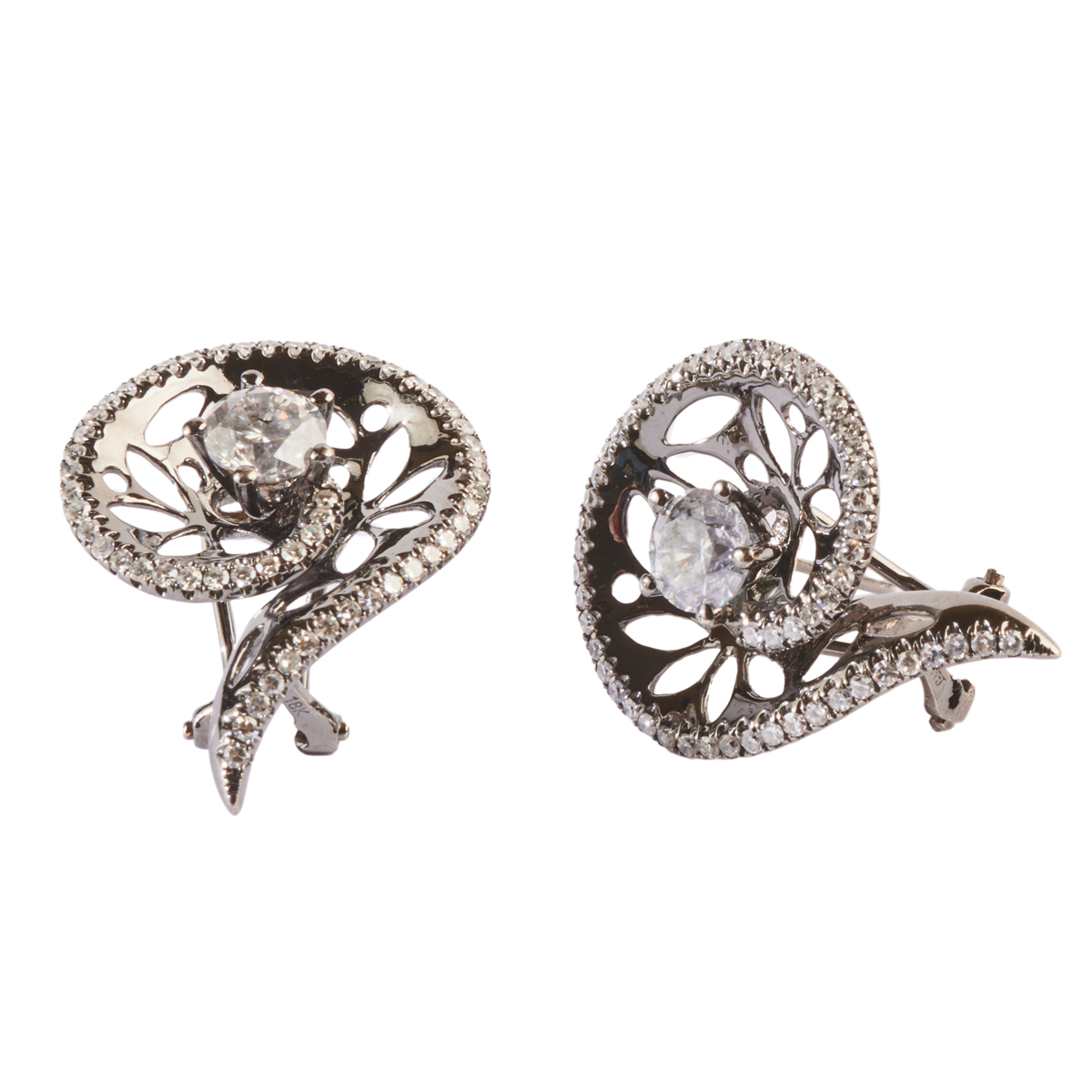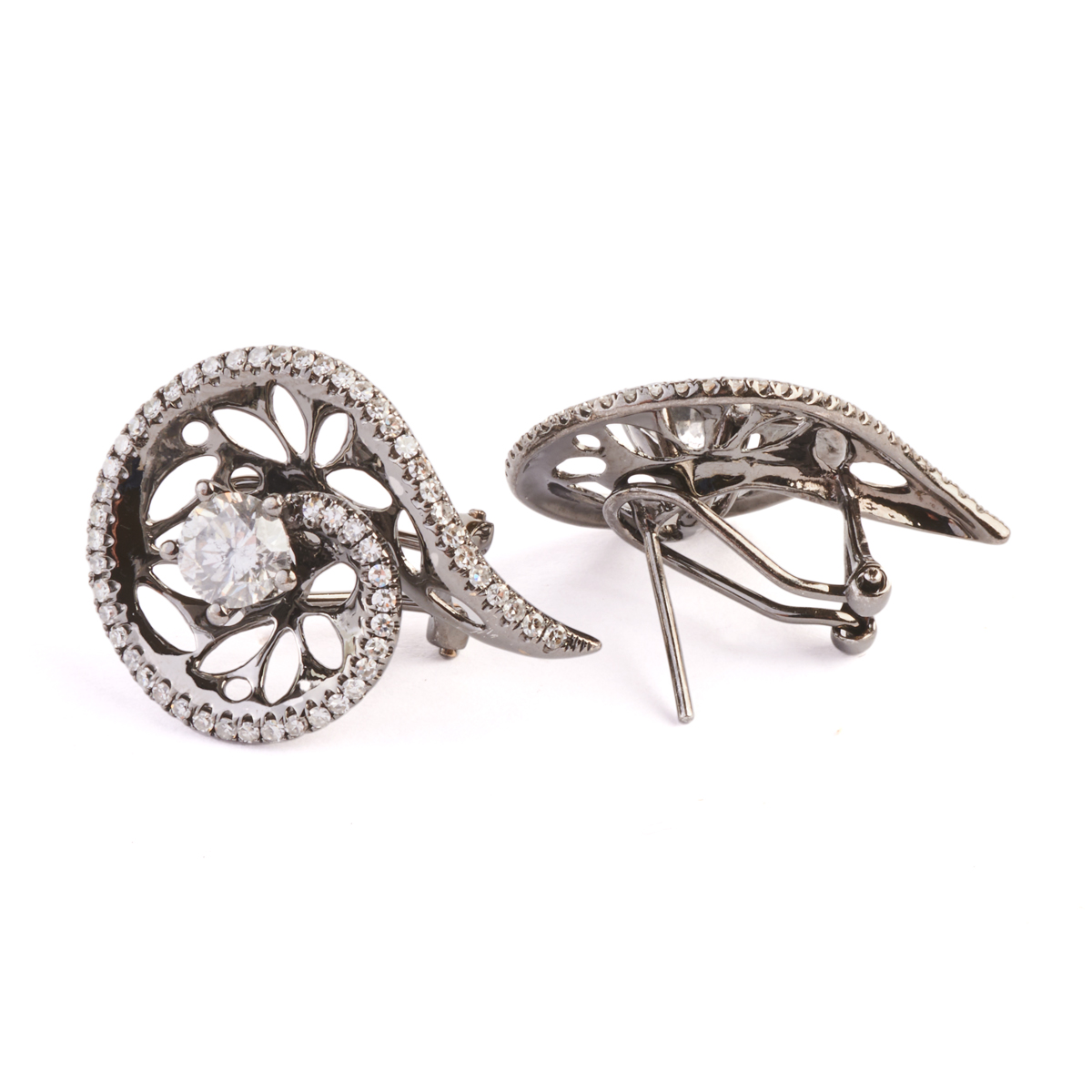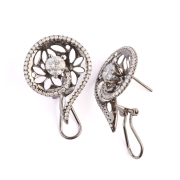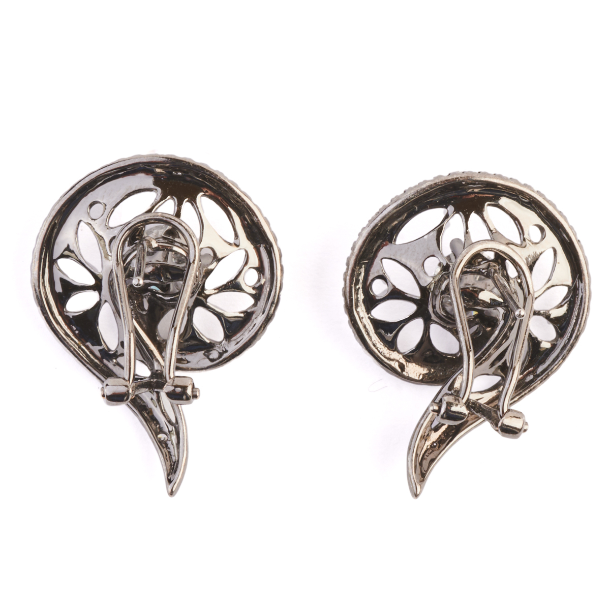 Each centering one round brilliant-cut diamond weighing approximately 0.75 ct., accented by fifty-five single-cut diamonds weighing a total of approximately 0.35 cttw., set in an oxidized 18k white gold mounting measuring approximately 25 x 19 mm. Total diamond weight for the pair is approximately 2.20 cttw.