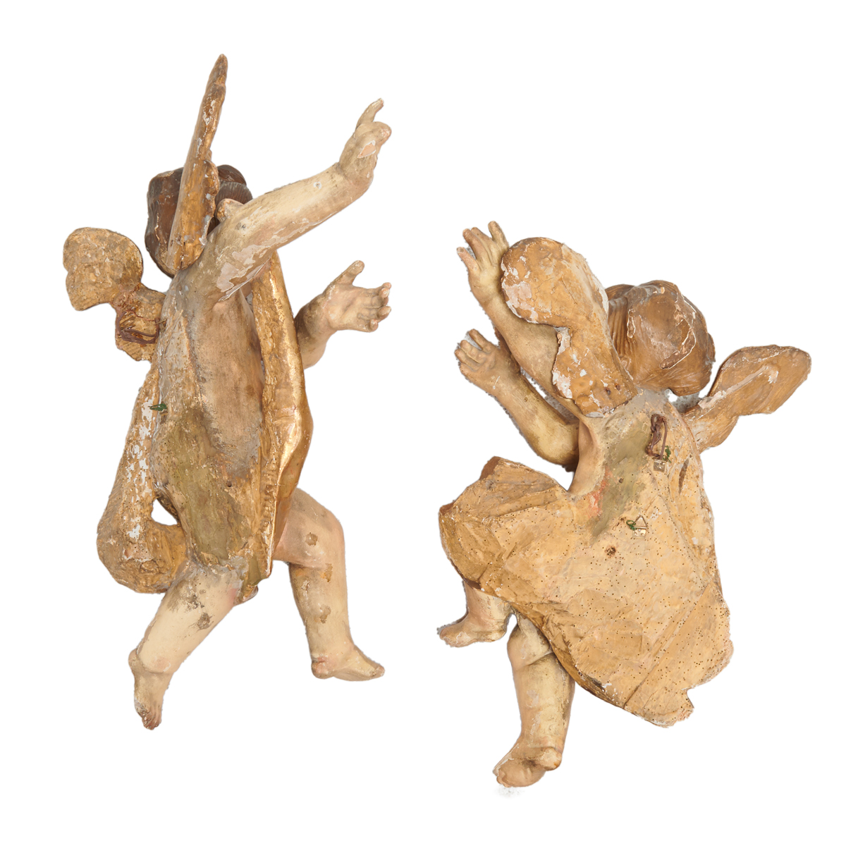 Condition: Surface wear with some paint loss and restoration throughout. Previous insect damage. Wings with numerous repairs and current cracks, also loose. One piece of wing separated piece available. Loss to fingers. One putto with repair to drapery.