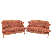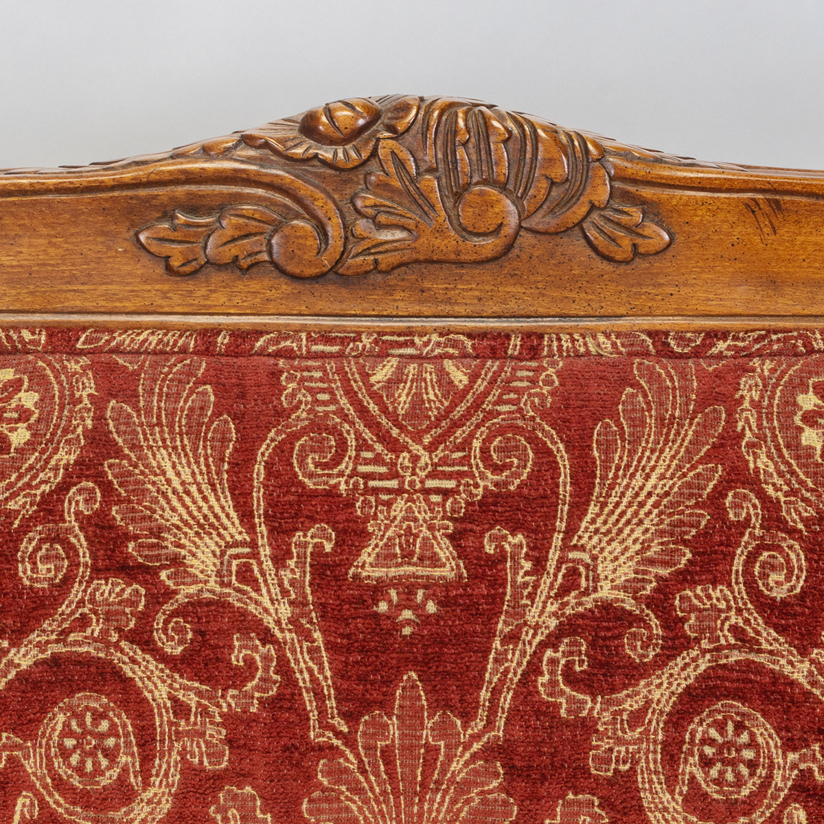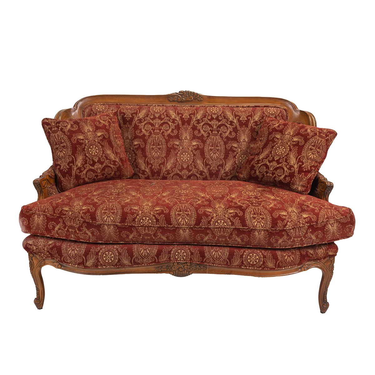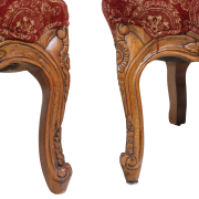 Carved frames with pale yellow on red upholstery, red on yellow to reverse with four spare pillow cushions.