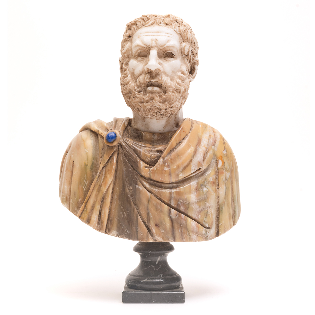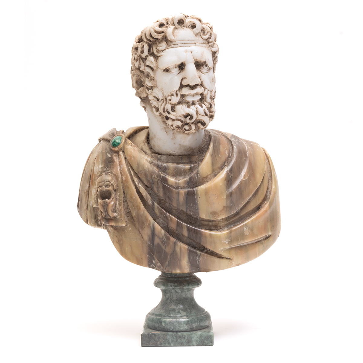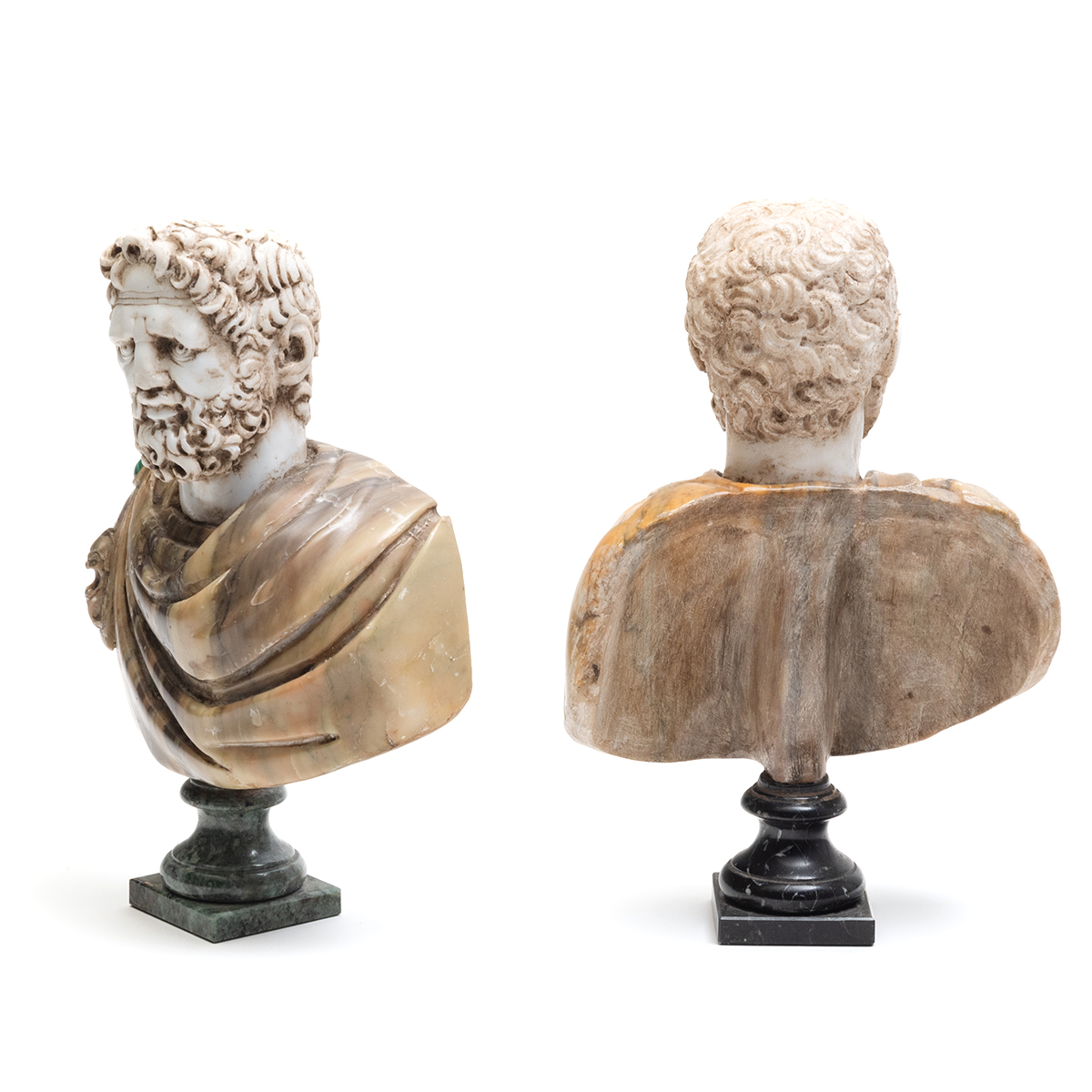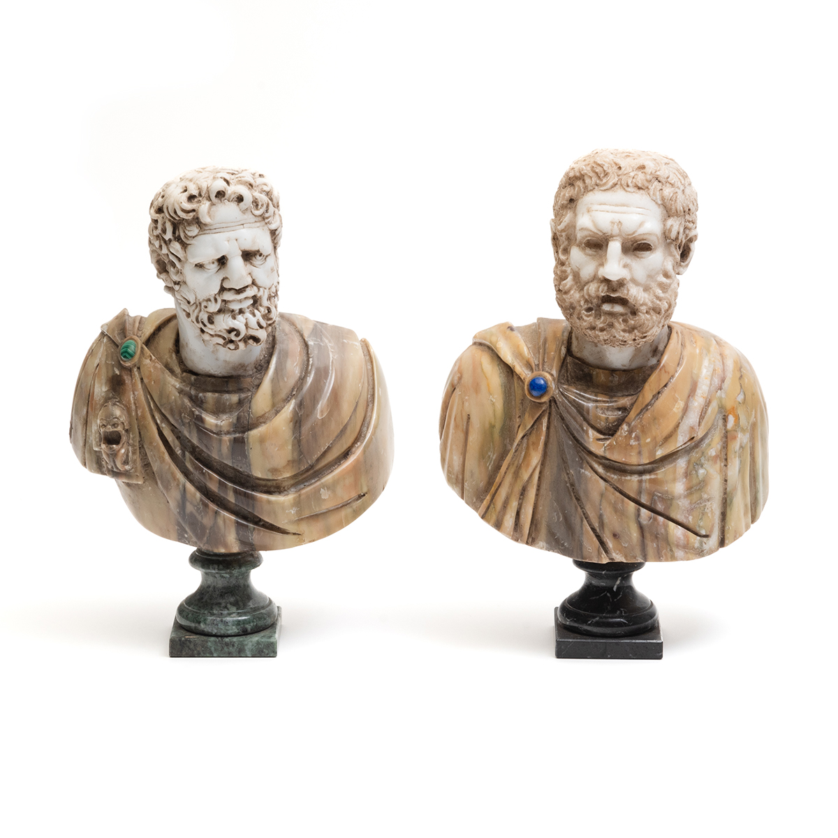 Both with alabaster heads one with light brown marble robe bearing malachite cartouche clasp, green marble pedestal the other with light brown/green marble robe bearing lapis cartouche clasp, black marble pedestal.
