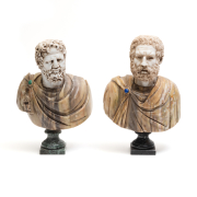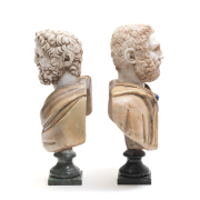 Condition: Some wear throughout, repairs to marble. One with loss to inset eyes. Both pedestal bases partly loose.
