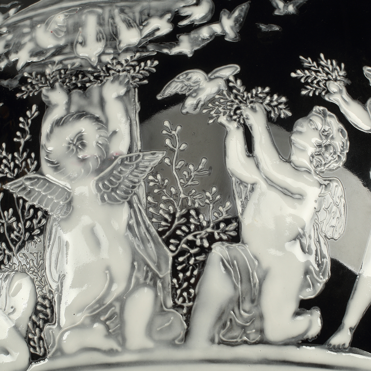 Black glaze with pate-sur-pate style decoration.