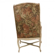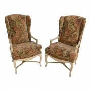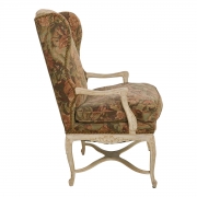 Patinated white painted carved frames, floral brocade upholstery.