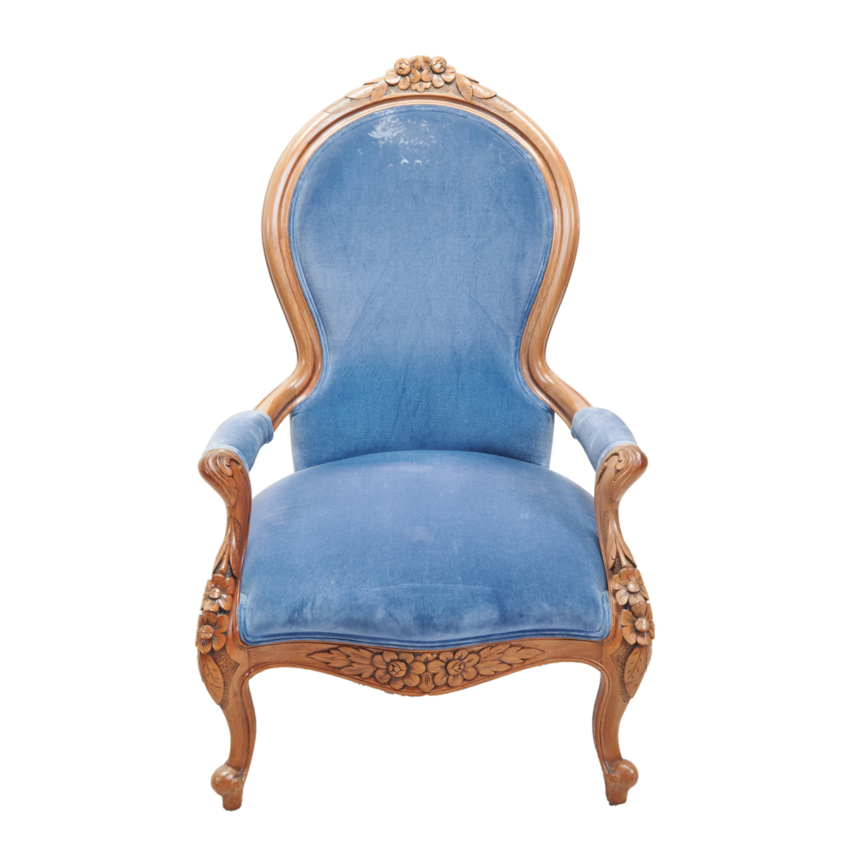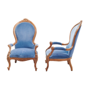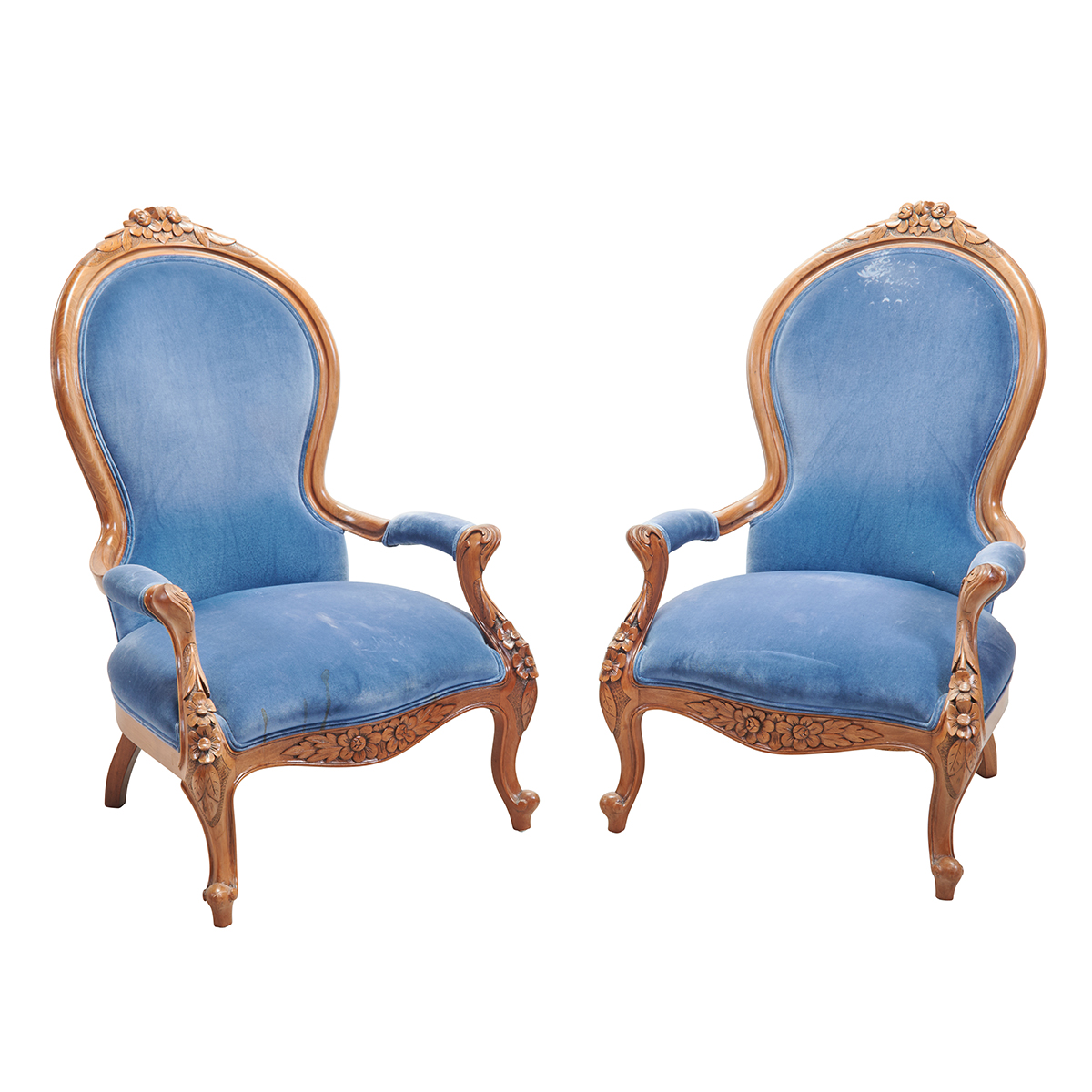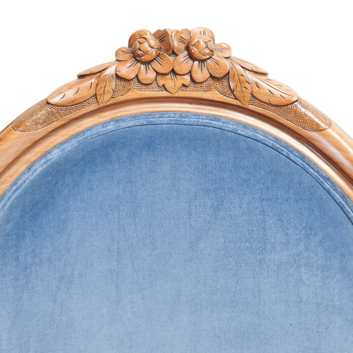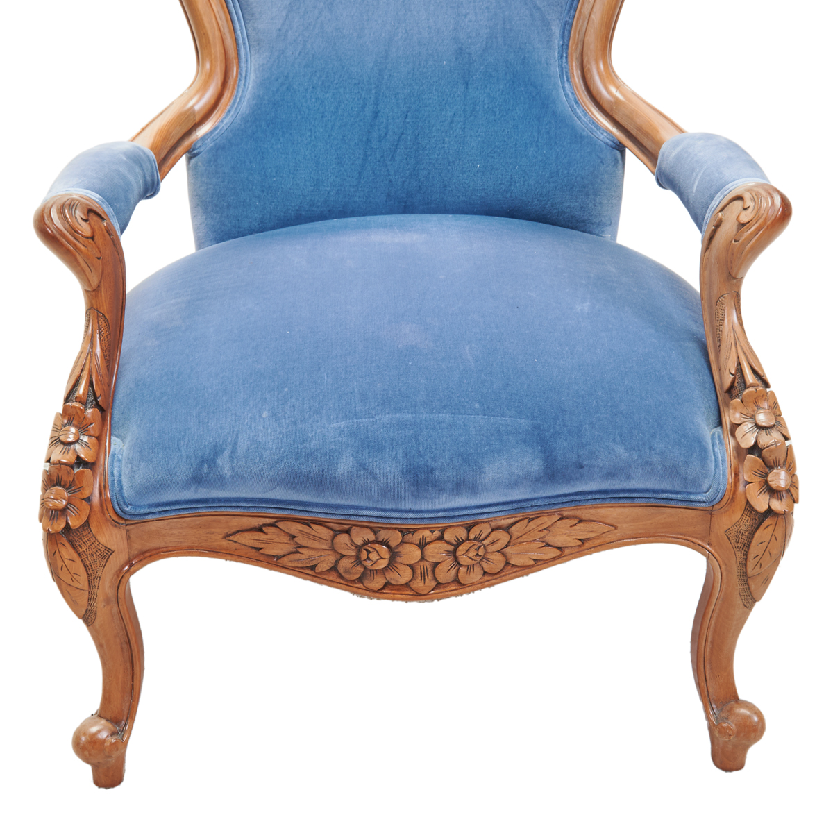The frames carved with floral motif and acanthus leaves to arms, blue velvet upholstery.