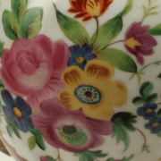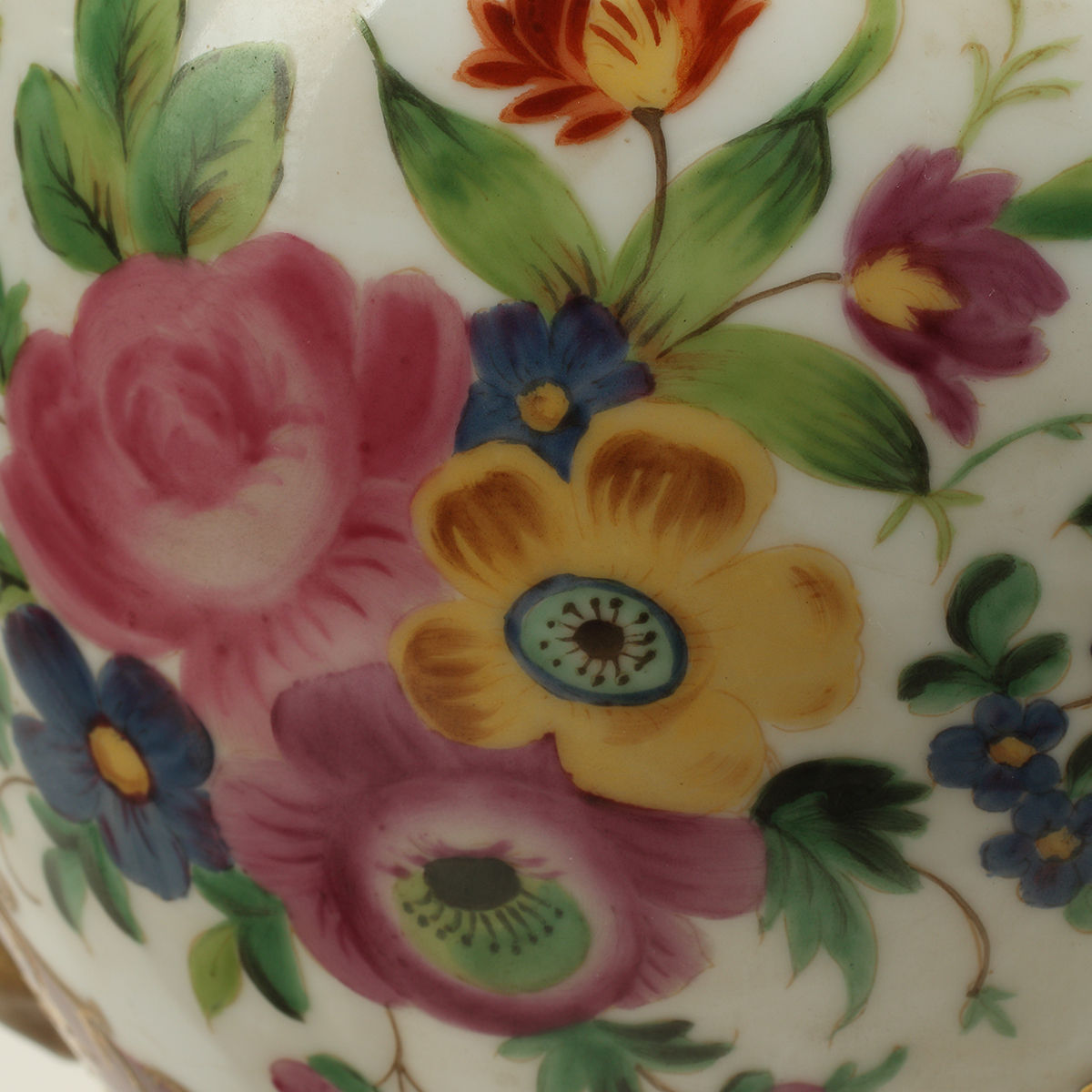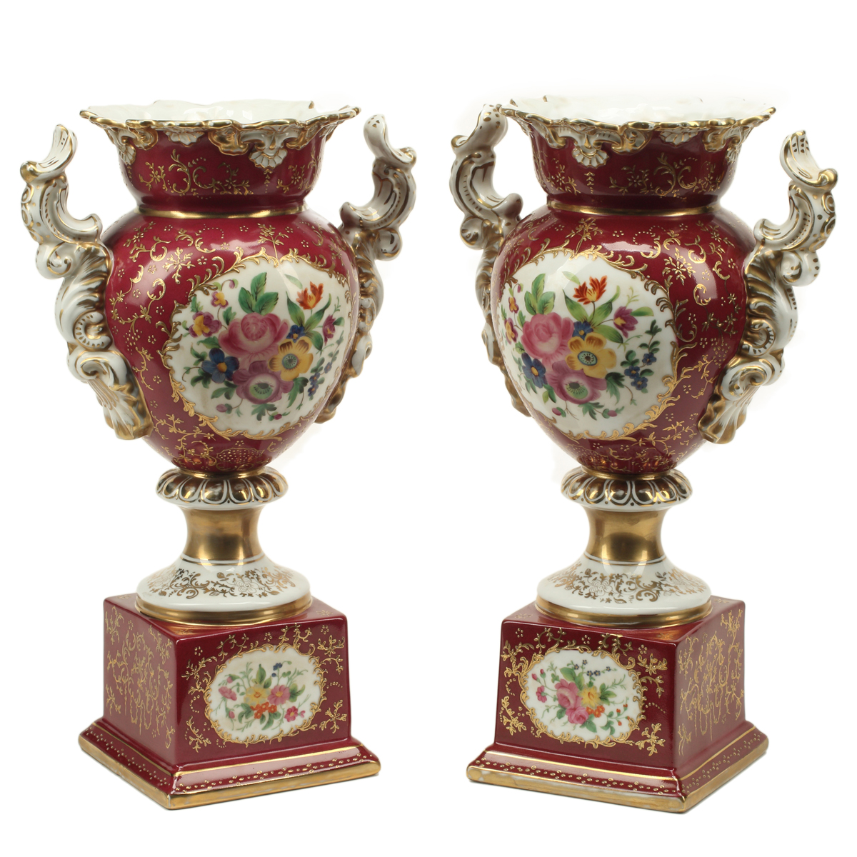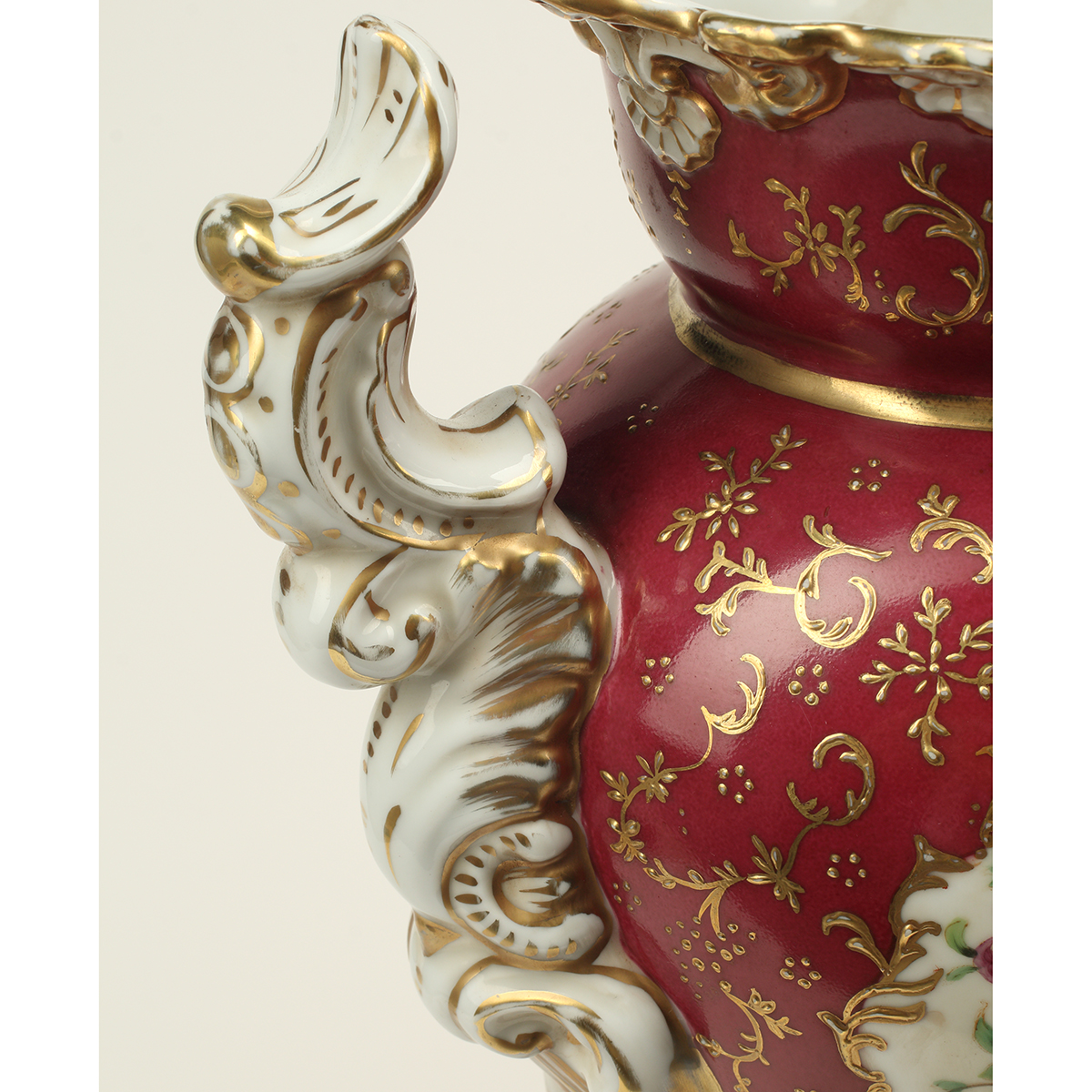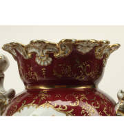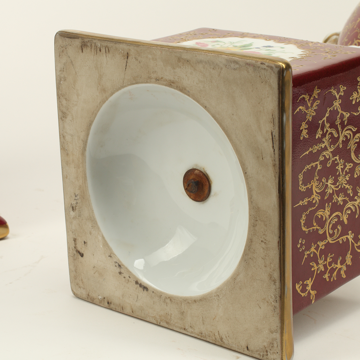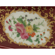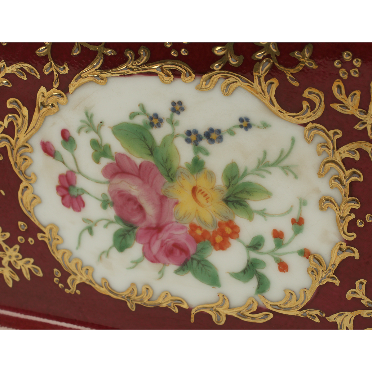 Floral motif on red glaze with parcel gilt trim, on boxed pedestal feet.