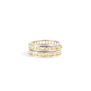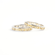 Each featuring numerous square-cut yellow sapphires, set in a 14k white gold eternity band mounting measuring approximately 3 mm in width.