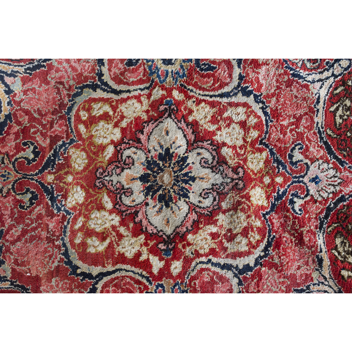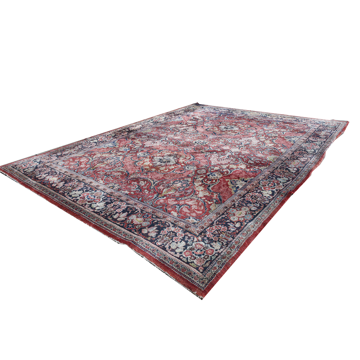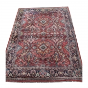 Central red field, dark blue main border, double inner and outer guards, floral and foliate vine motif throughout.