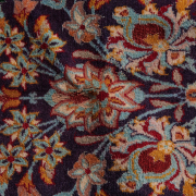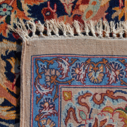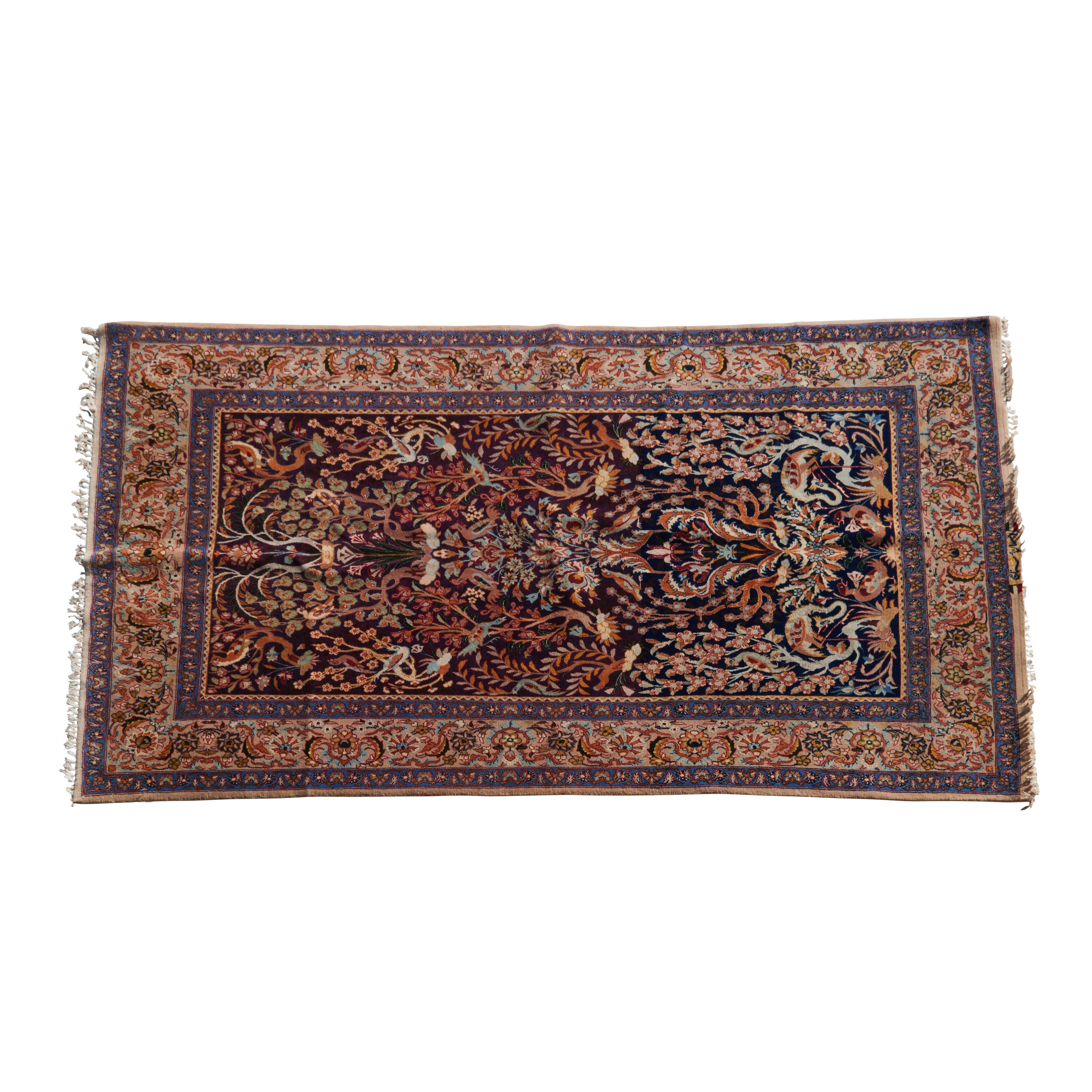 Central tree of life motif on purple to blue ground, beige main border with single border guards, inscription woven to one end woven in blues, purple, greens, yellow, cream, browns.