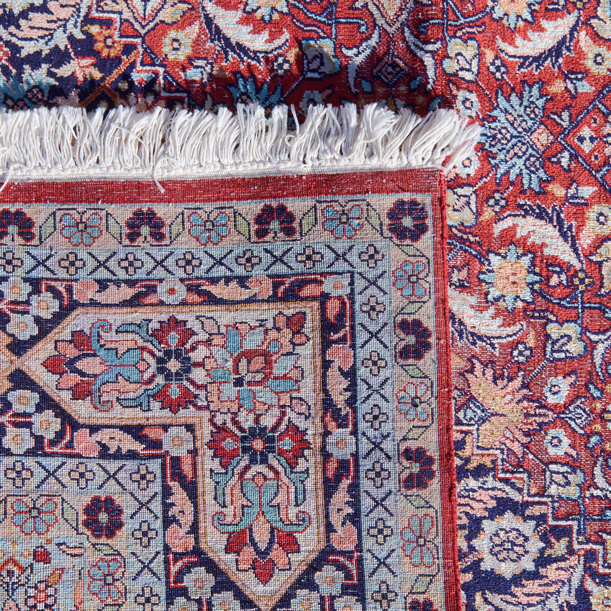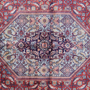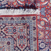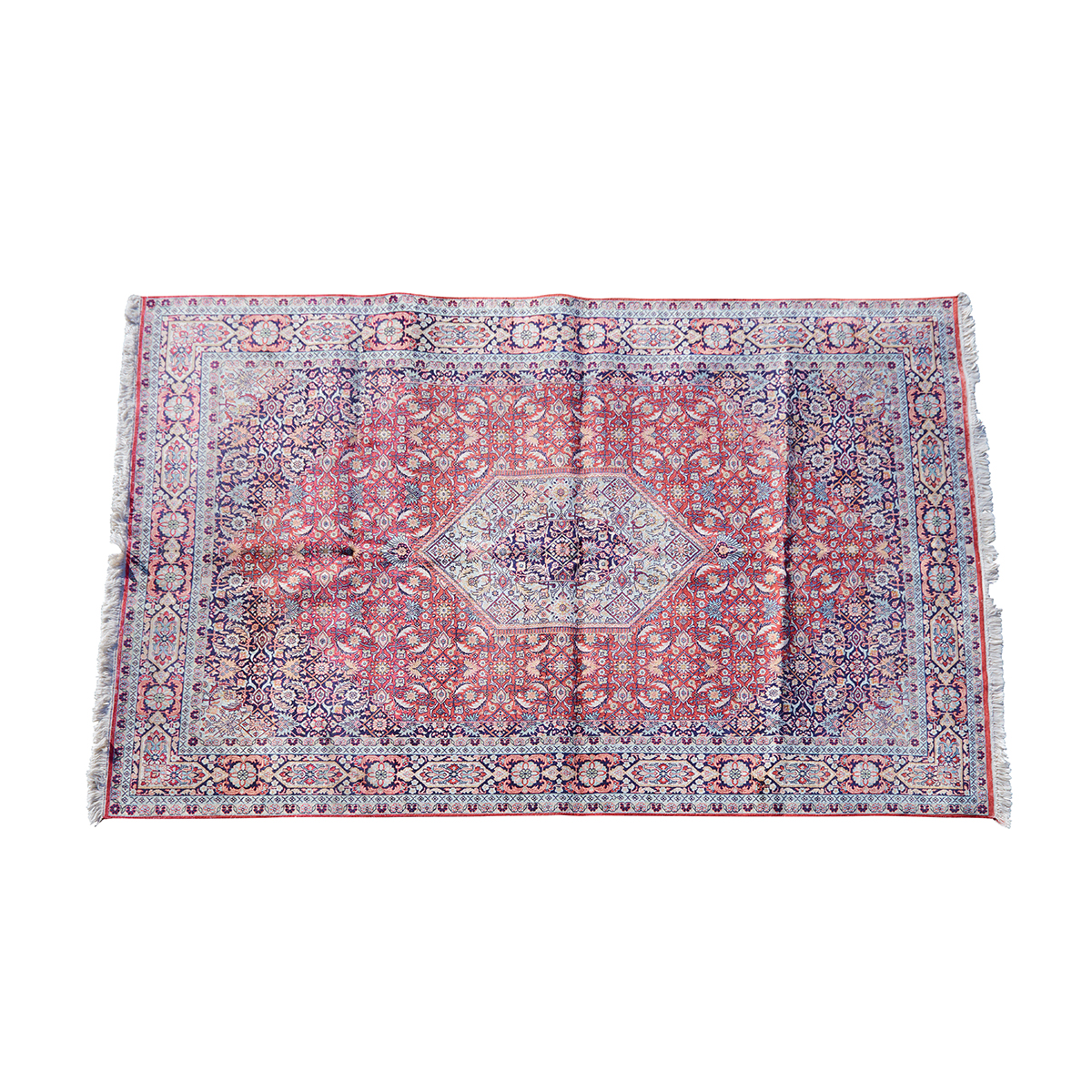 Central medallion on red ground, dark blue spandrels, dark blue main border with double guards woven in blues, pink, red, light brown, cream.