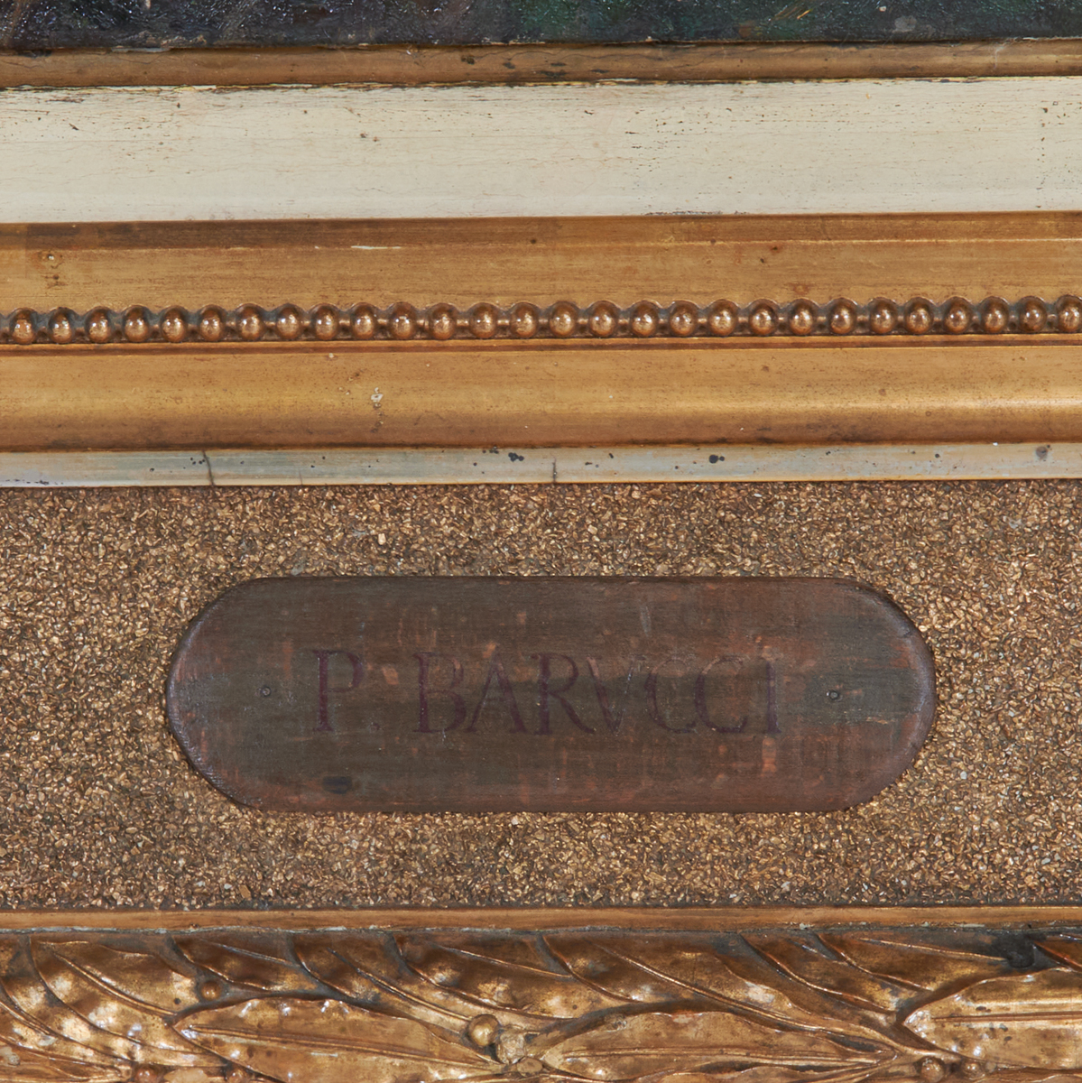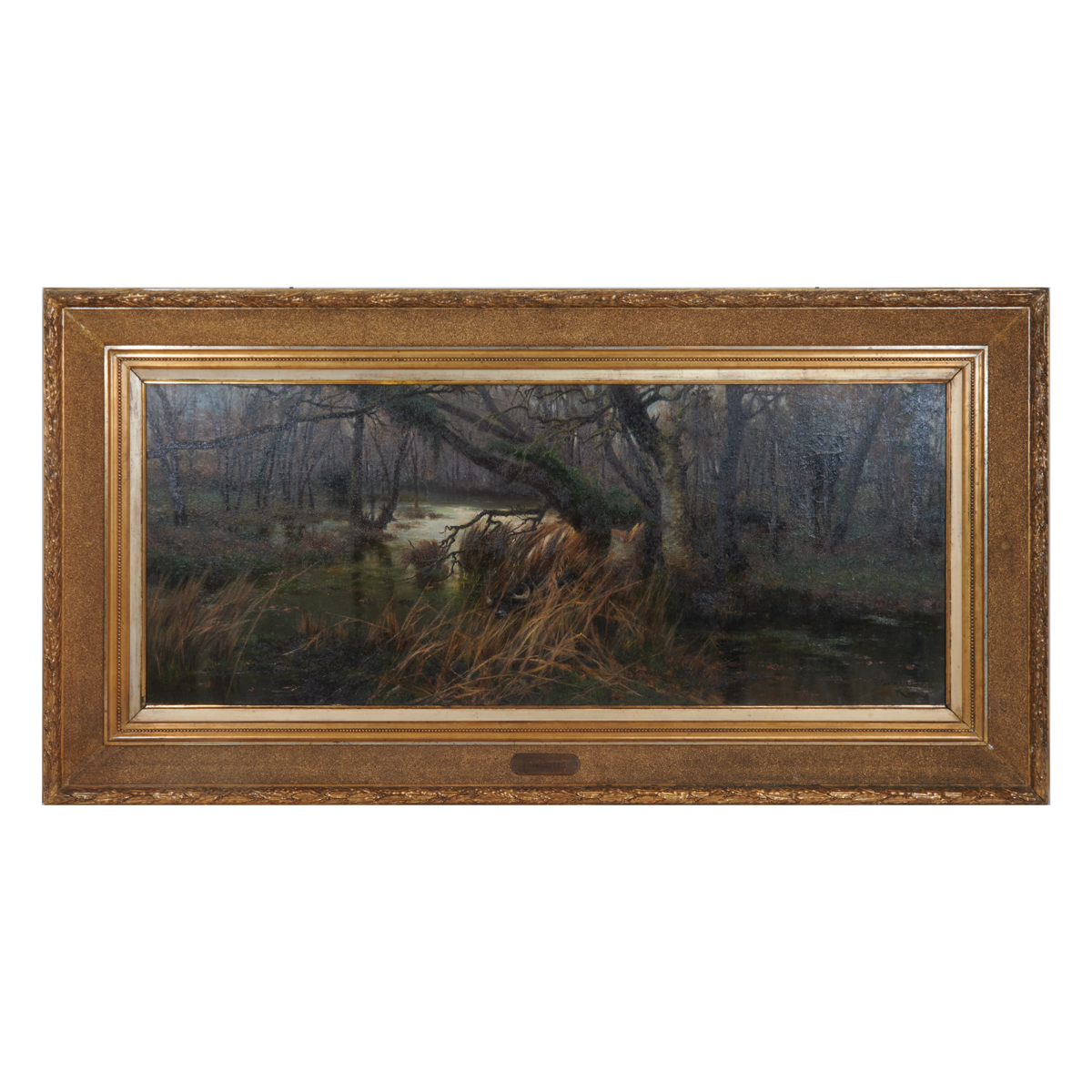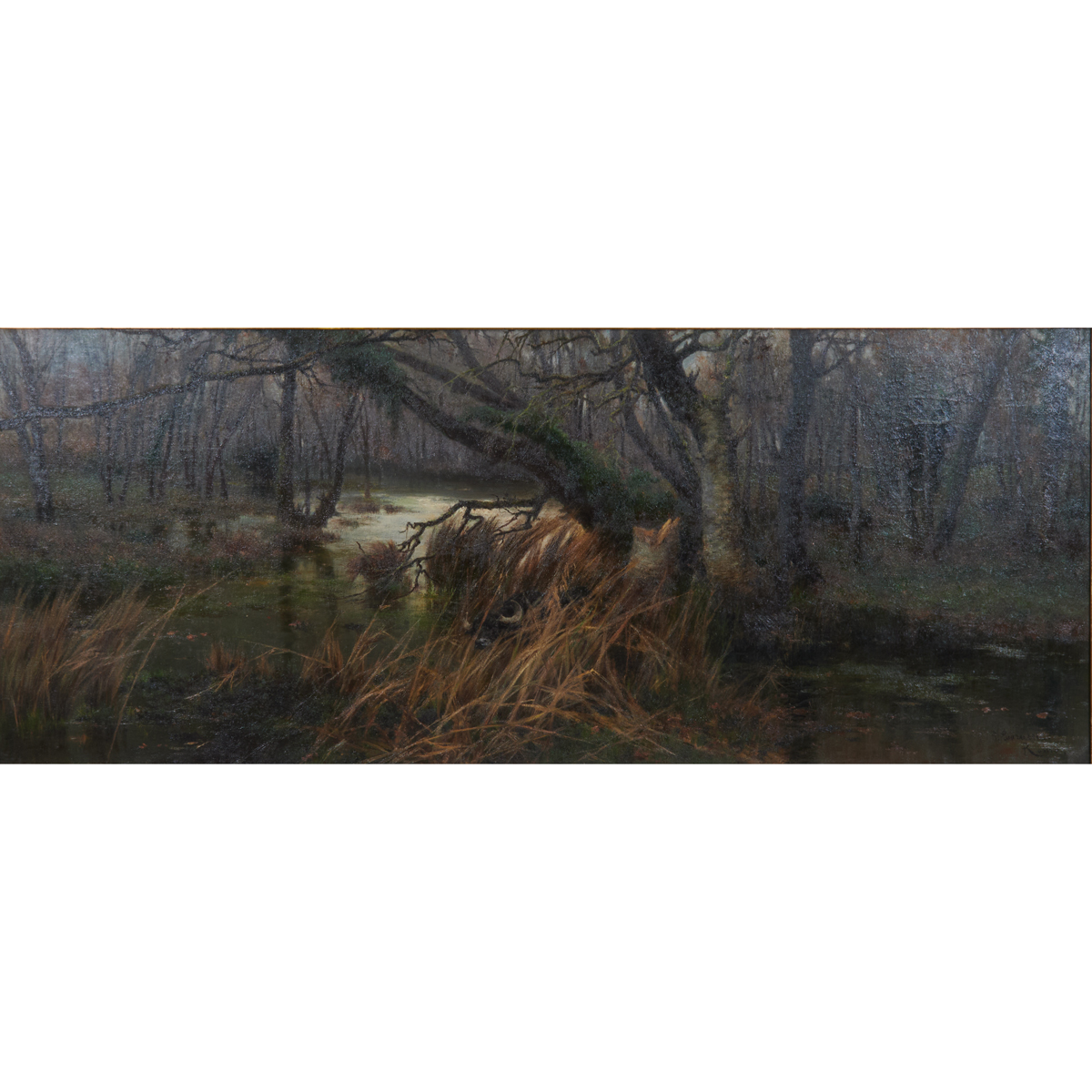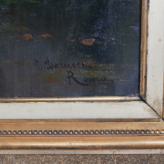 Notes: Frame has wear, approximate dimensions - framed: 50 x 96 inches. Further details: A member of the Roman Campagna Romana Artists, Barucci is particularly appreciated for his capacity in depicting the essence of the Roman countryside and its swamp waters, the natural habitat of water buffalos. The stagno macarese is the area of land which now extends beyond what is now known as the airport of Fiumicino. Due to the scale of this painting, it was quite possibly painted for an international exhibition. The artist studied at the Accademia di Belle Arti di Roma. His work was exhibited at the Belle Arti di Roma in 1883, in Chicago in 1893, and at the Salon des Independants in Paris in 1907.