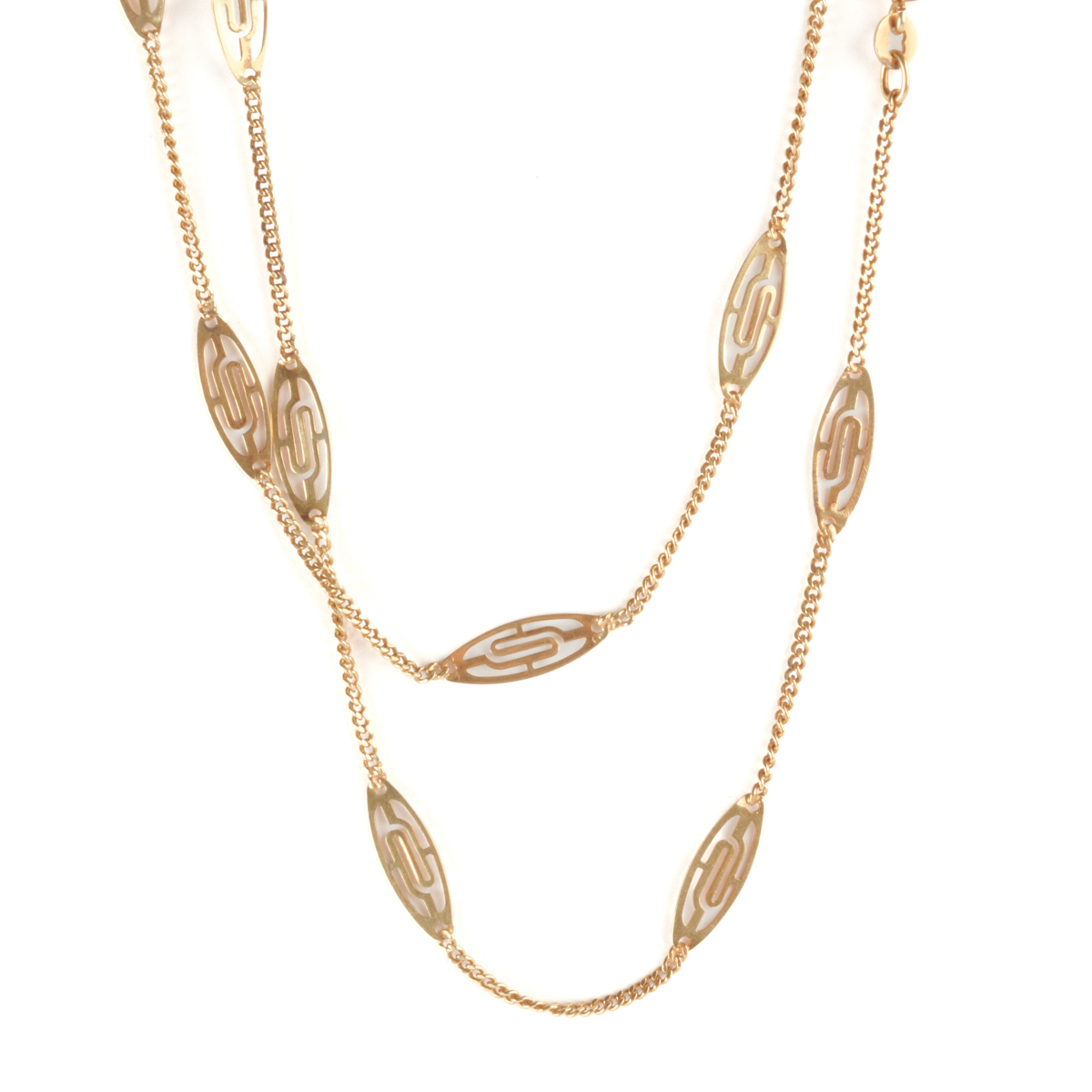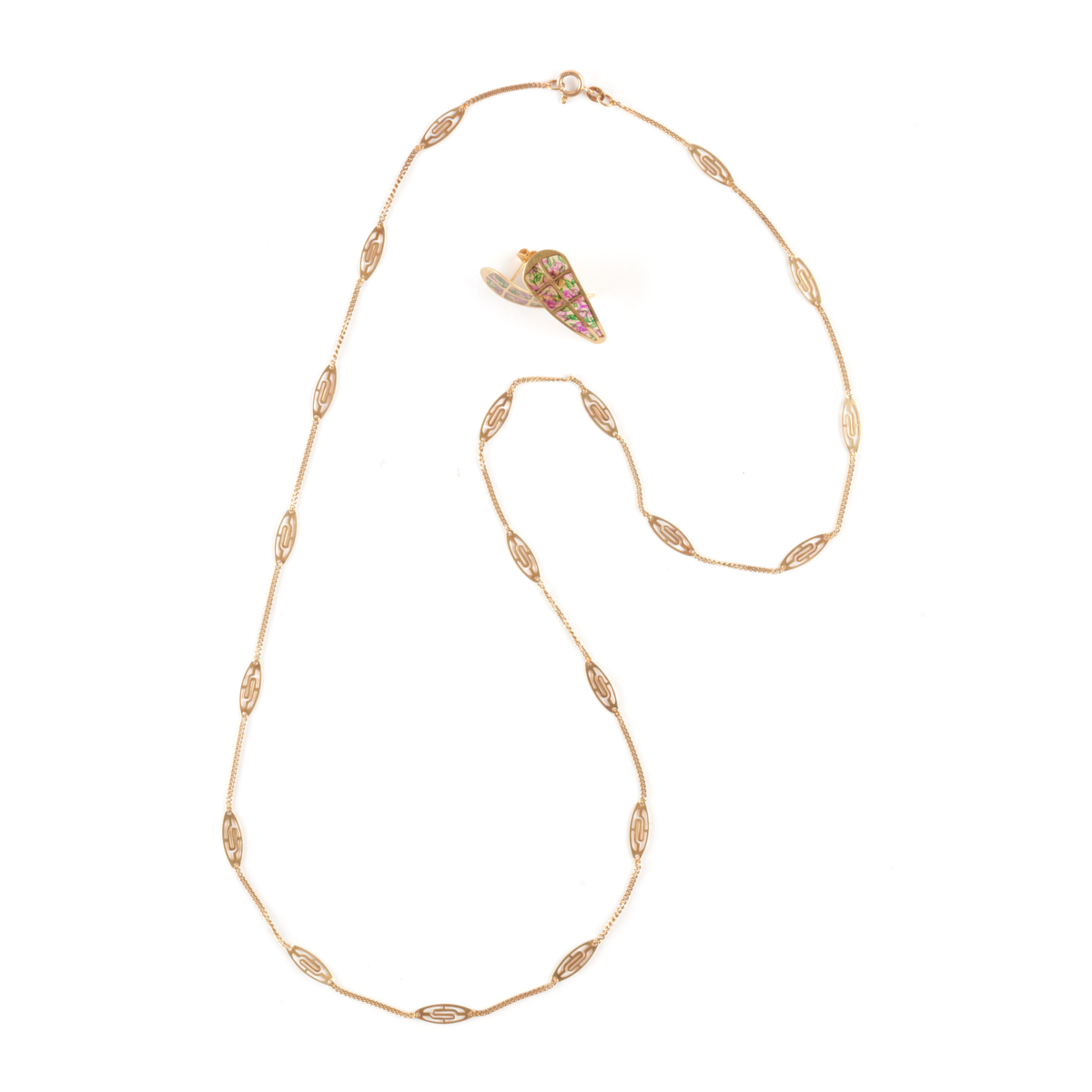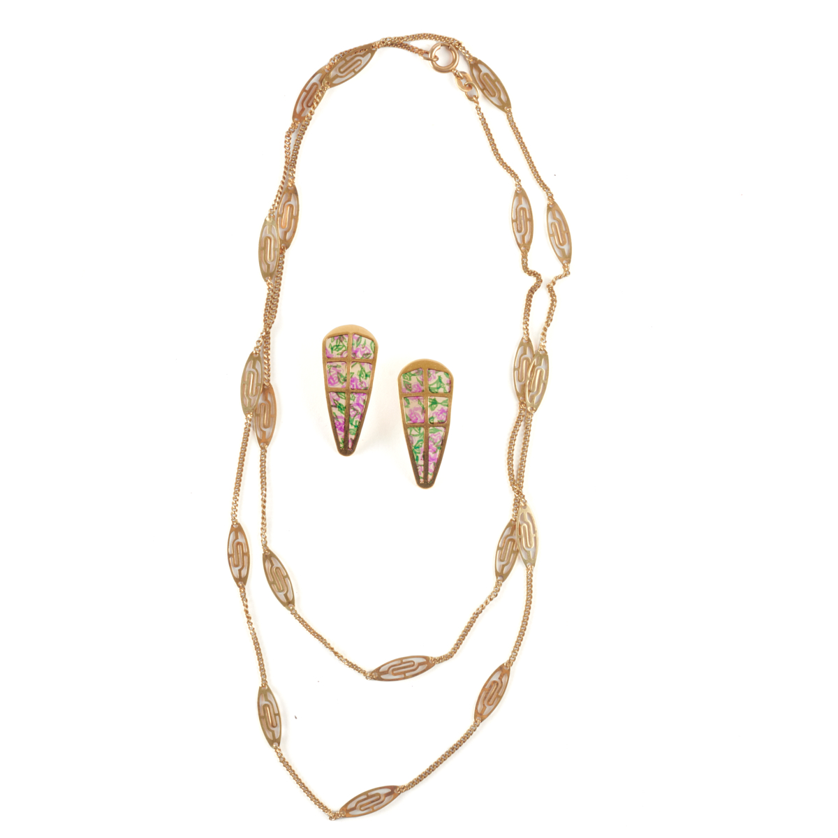 Including one pair of plique-a-jour floral motif enamel, 18k yellow gold earrings measuring approximately 30 x 12 mm together with a vintage 14k yellow gold 30 inch necklace.