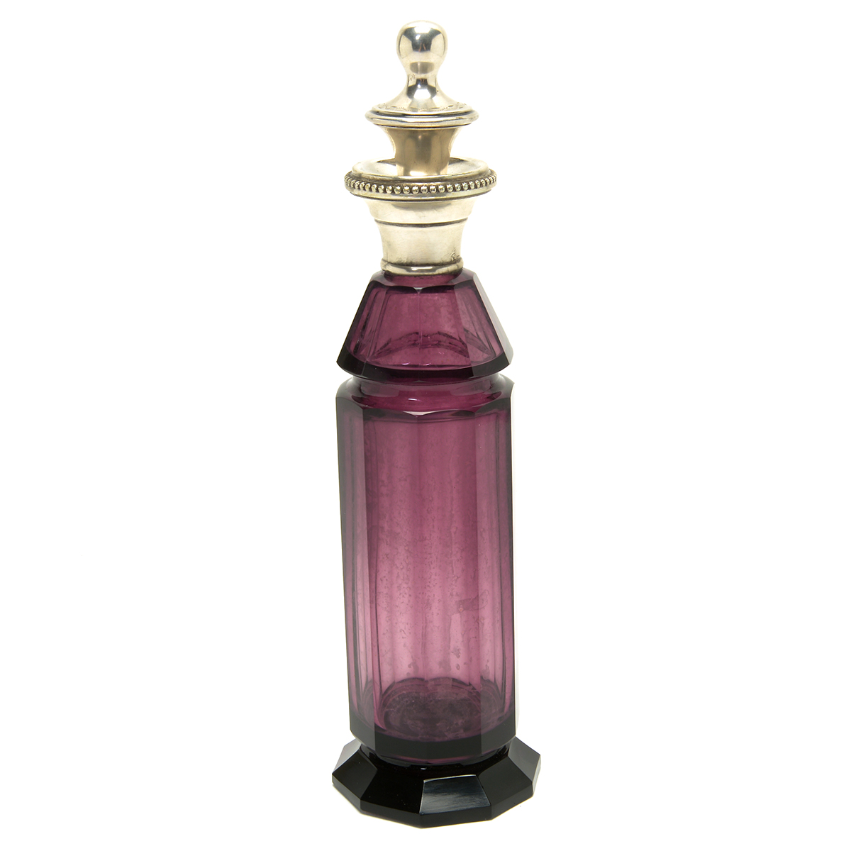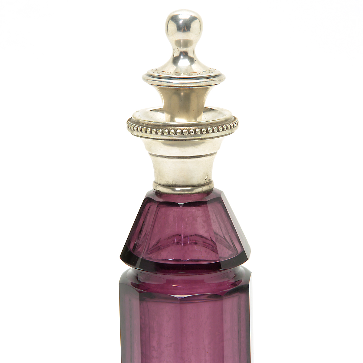Decagonal form with an 800 silver mounted mouth and stopper.