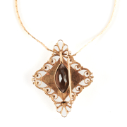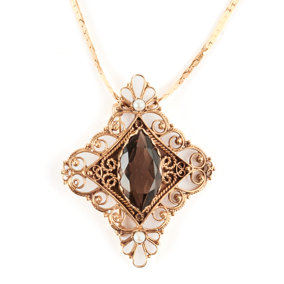 Featuring one marquise-cut smoky quartz measuring approximately 19.7 x 10.3 mm, accented by two seed pearls, set in a 14k yellow gold open work pendant brooch mounting measuring approximately 47 x 38 mm, suspended from a 14k yellow gold chain, forming a 16 inch necklace.