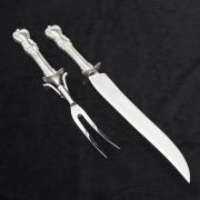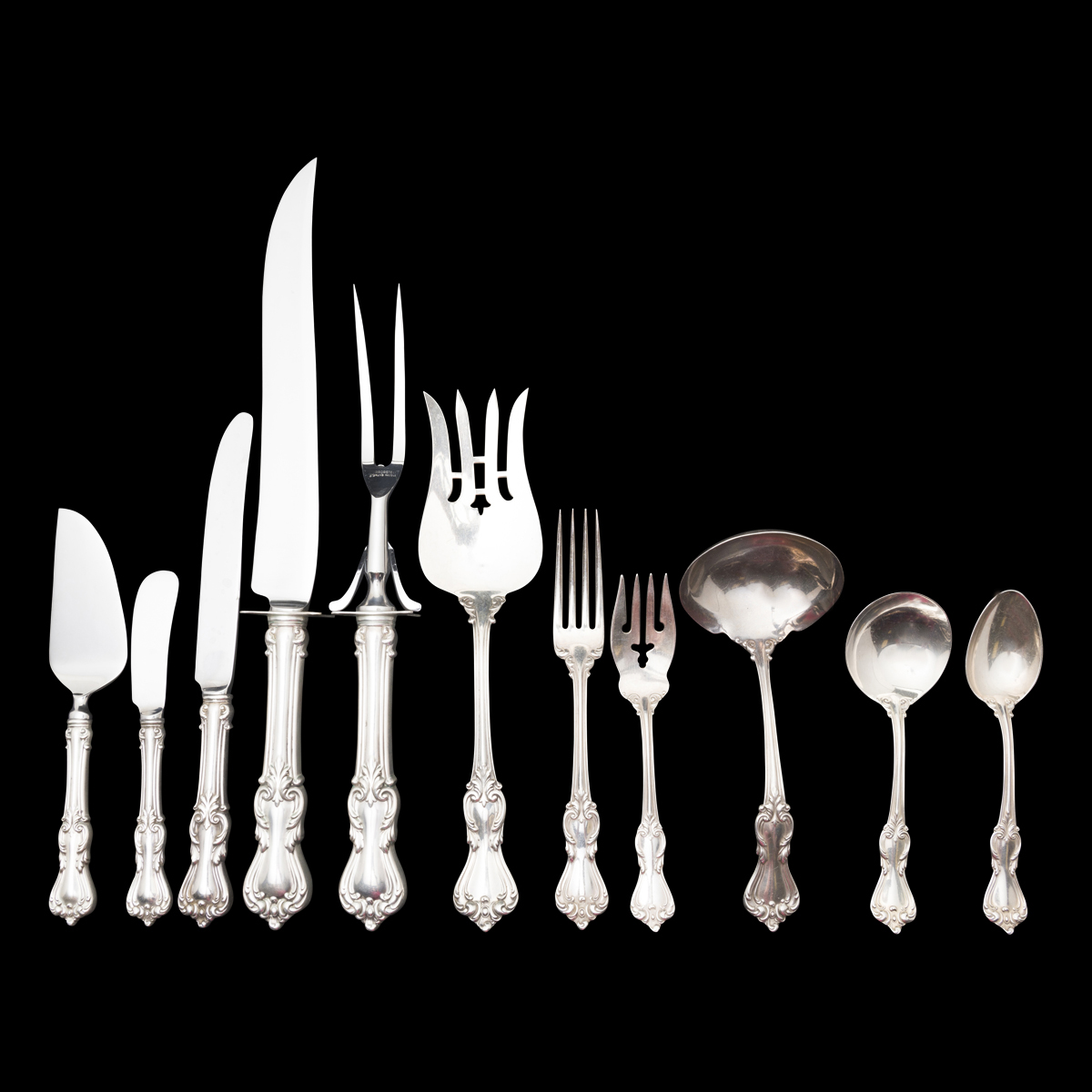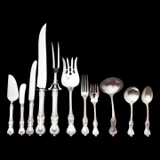 Comprising 12 dinner knives, 8 butter knives, 12 dinner knives, 16 salad forks, 18 teaspoons, 12 bouillon spoons, 3 tablespoons, 1 carving fork, 1 carving knife, 1 gravy ladle, 1 serving fork, 1 cheese knife, 1 sugar spoon, 1 master butter knife additional pieces comprising 2 Gorham sugar spoons, 1 small ladle, 1 baby fork, 1 baby spoon. (93 pieces total).