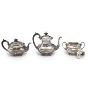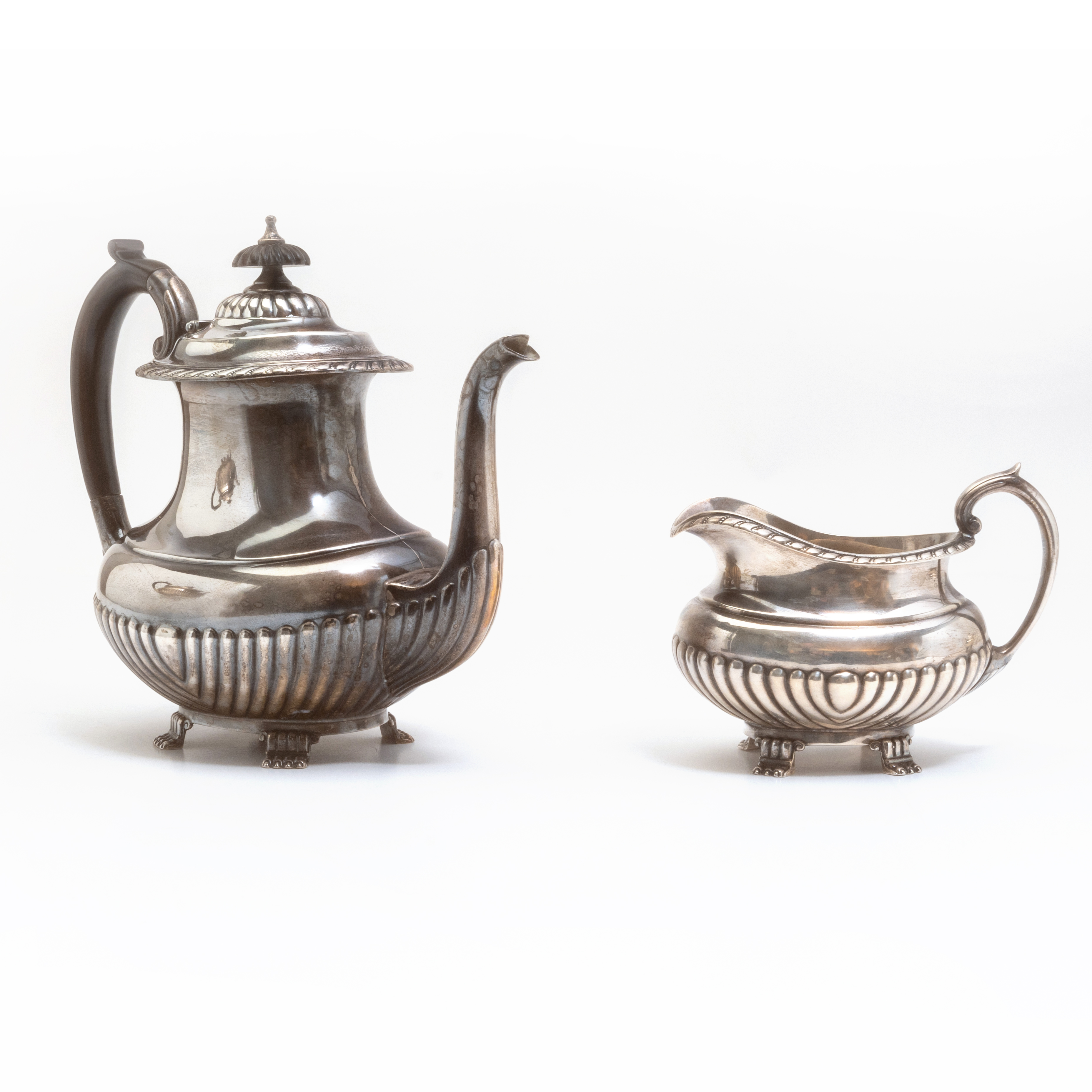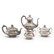 Comprising coffee pot, teapot, covered sugar, creamer ebonized wood knops and handles.