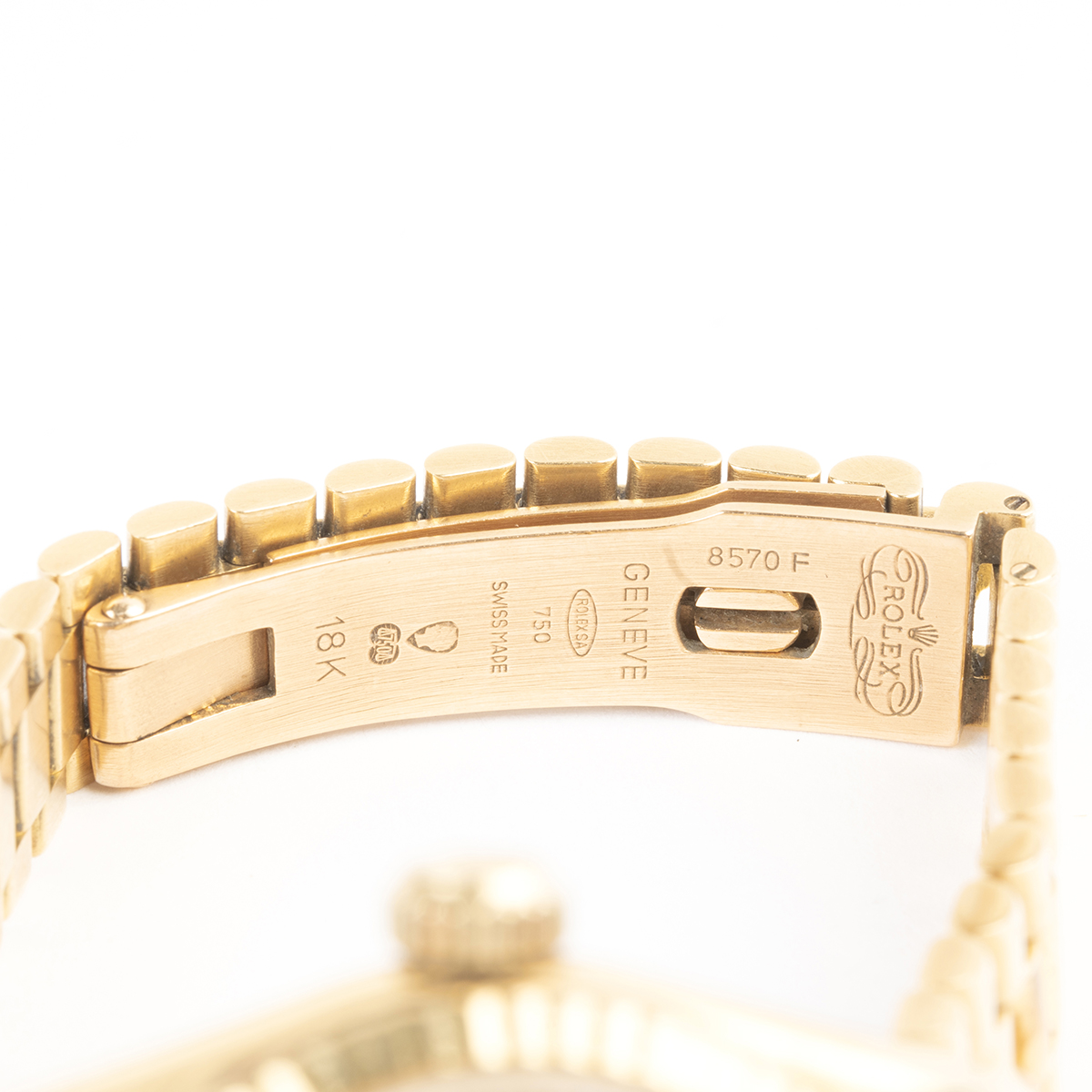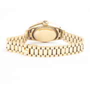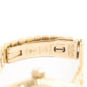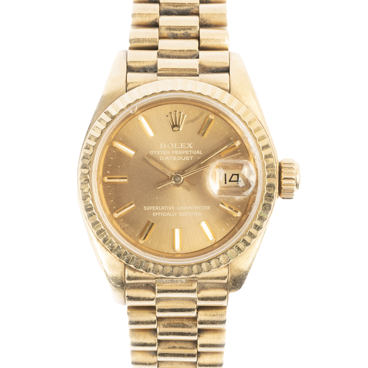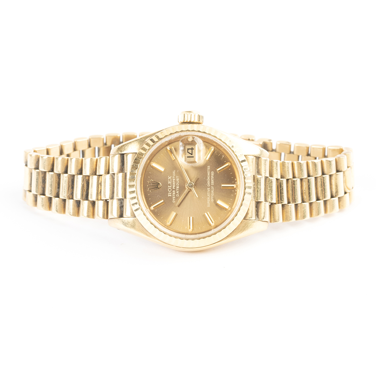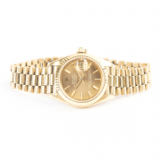DIAL: Round, gold, gold index hour markers, outer minutes track, date aperture at 3 oclock, gold center sweep seconds hand, gold luminous hands, Rolex Oyster Perpetual Datejust, Superlative Chronometer Officially Certified, Swiss. MOVEMENT: Automatic (not opened). CASE: Barrel, 18k yellow gold, four lugs, fluted bezel, serial no. 8058137, 26 mm. BRACELET: 18k yellow gold, president link 13 mm to 10 mm, deployant Rolex clasp, 6 1/2 inches.