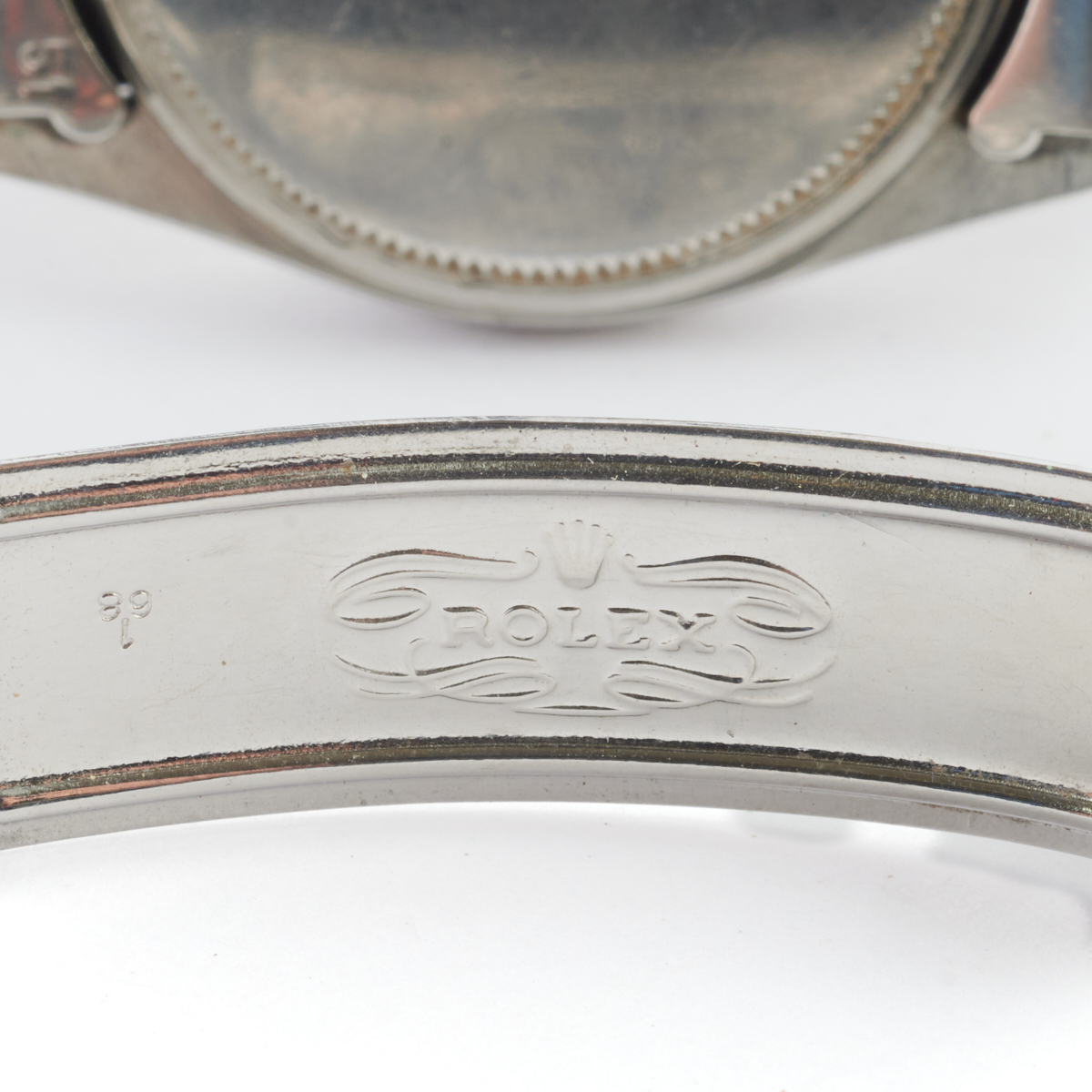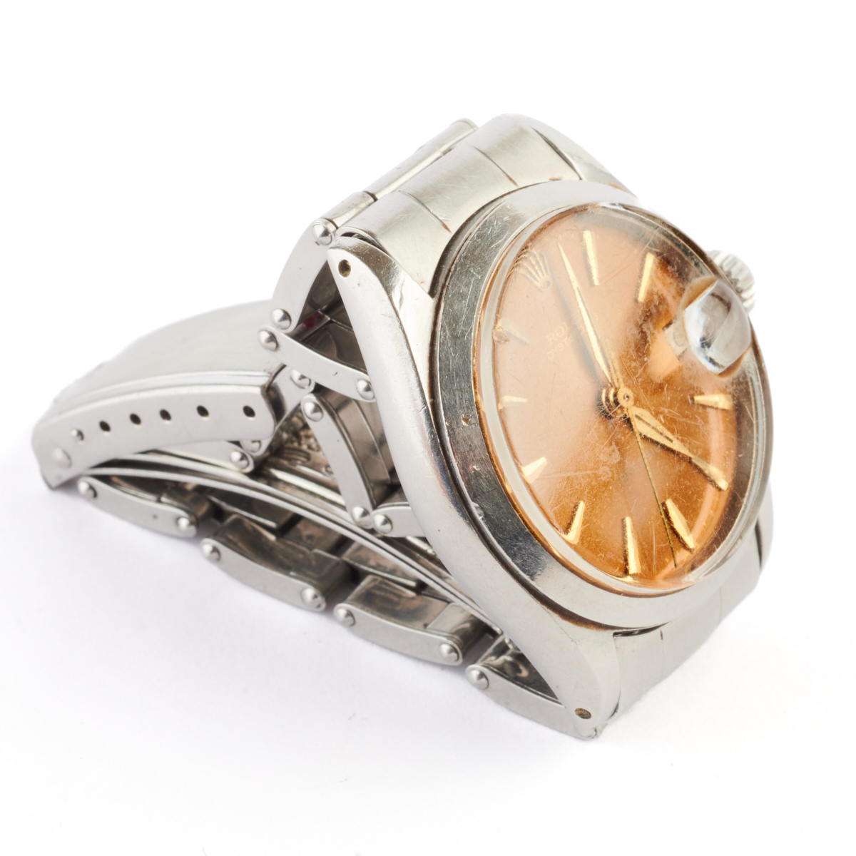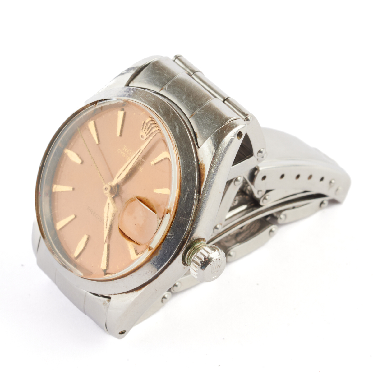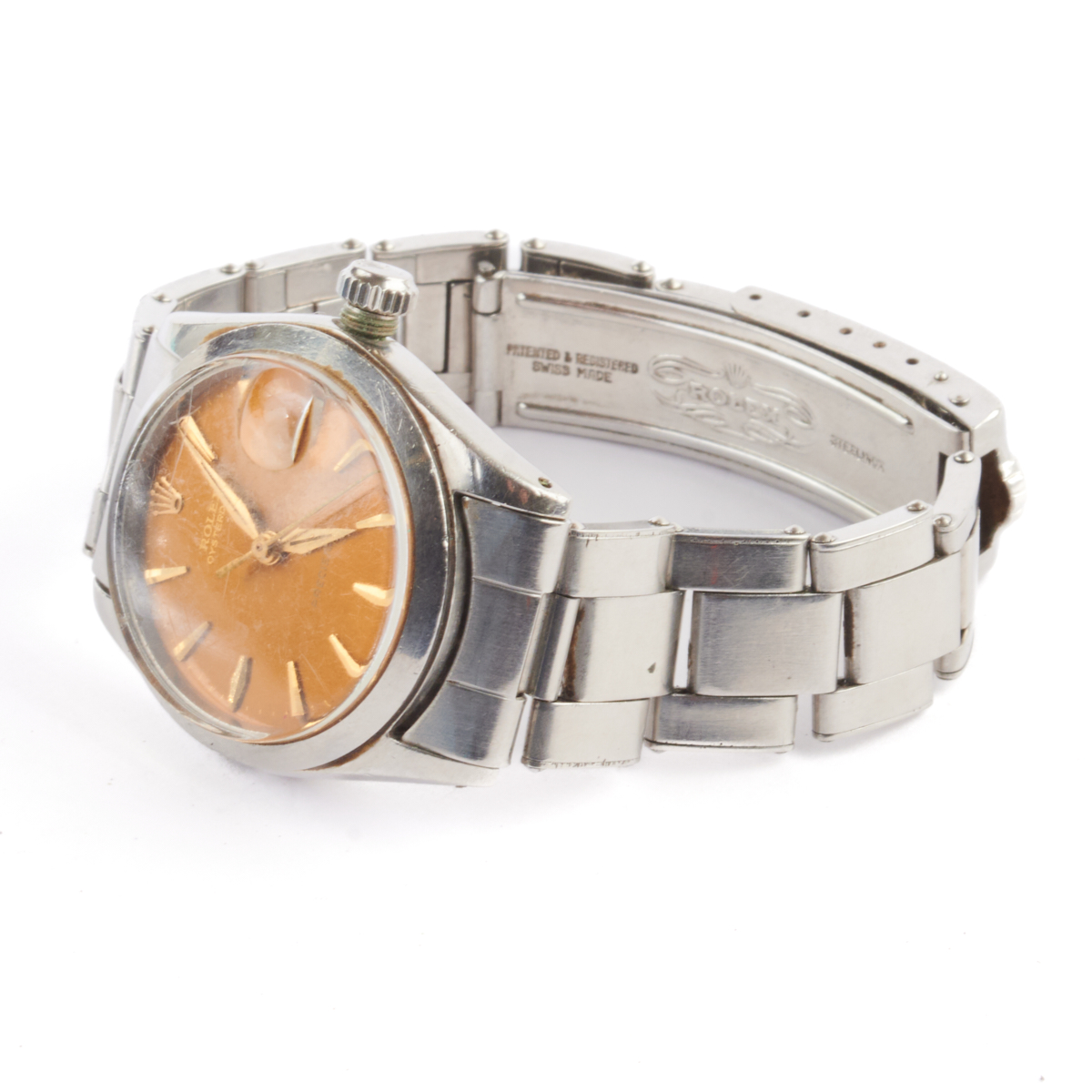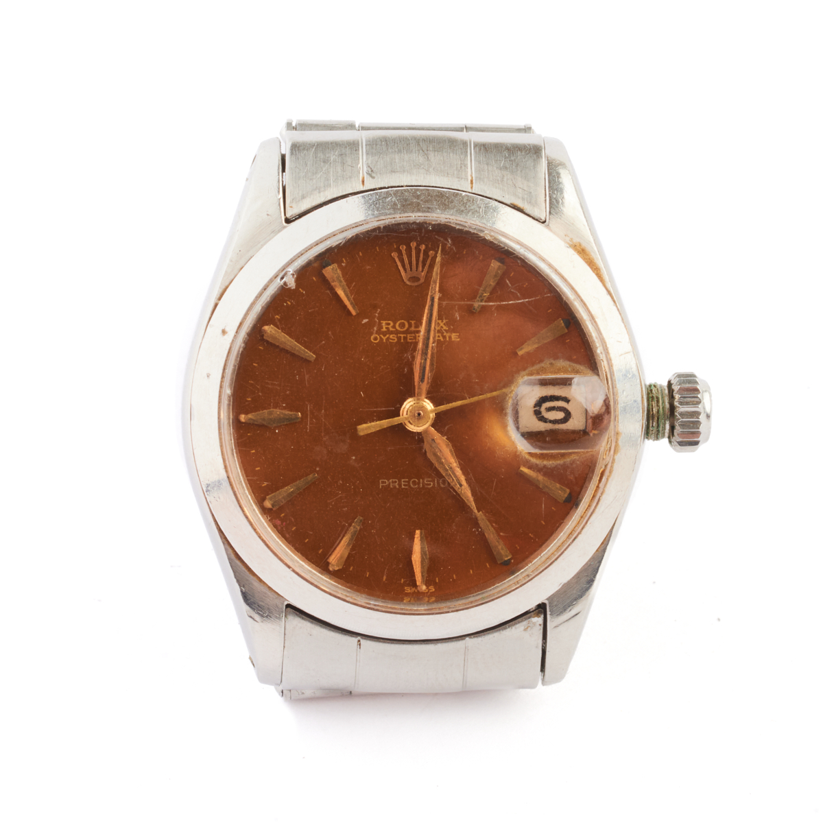 DIAL: Round, brownish gold, gold Rolex and index hour markers, outer gold minutes track, date aperture at 3 oclock, center gold sweep seconds hand, gold dauphine hands, Rolex, Oysterdate, Precision, Swiss. MOVEMENT: Automatic (not opened). CASE: Barrel, stainless steel, four lugs, 30 mm. STRAP: Stainless steel, oyster link, deployant clasp engraved Ray, 6 inches.