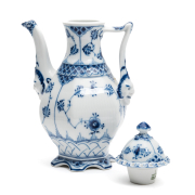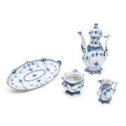 Blue Fluted full-lace pattern comprising miniature coffee pot, creamer, open sugar bowl, and oval tray.