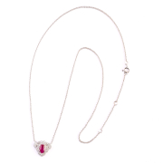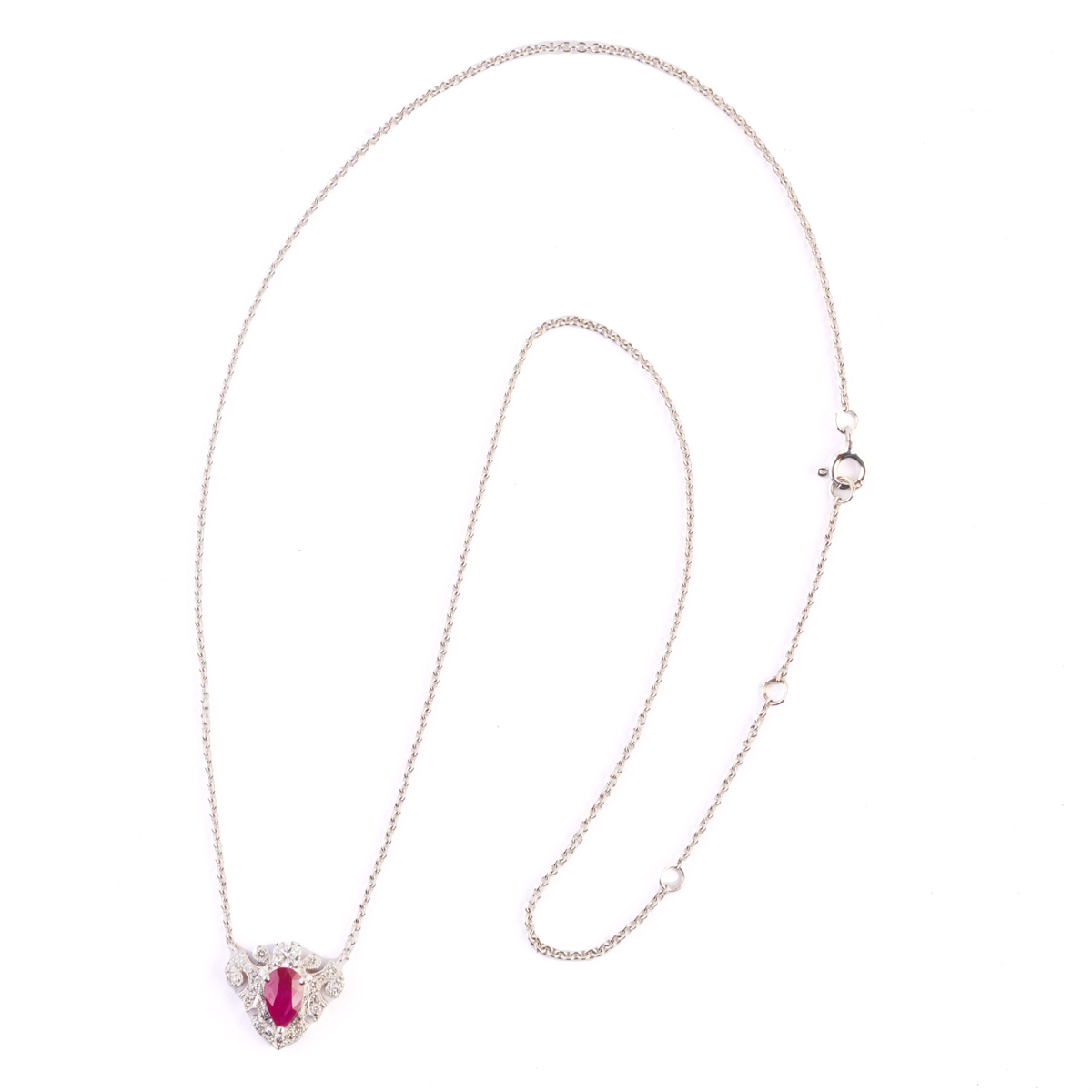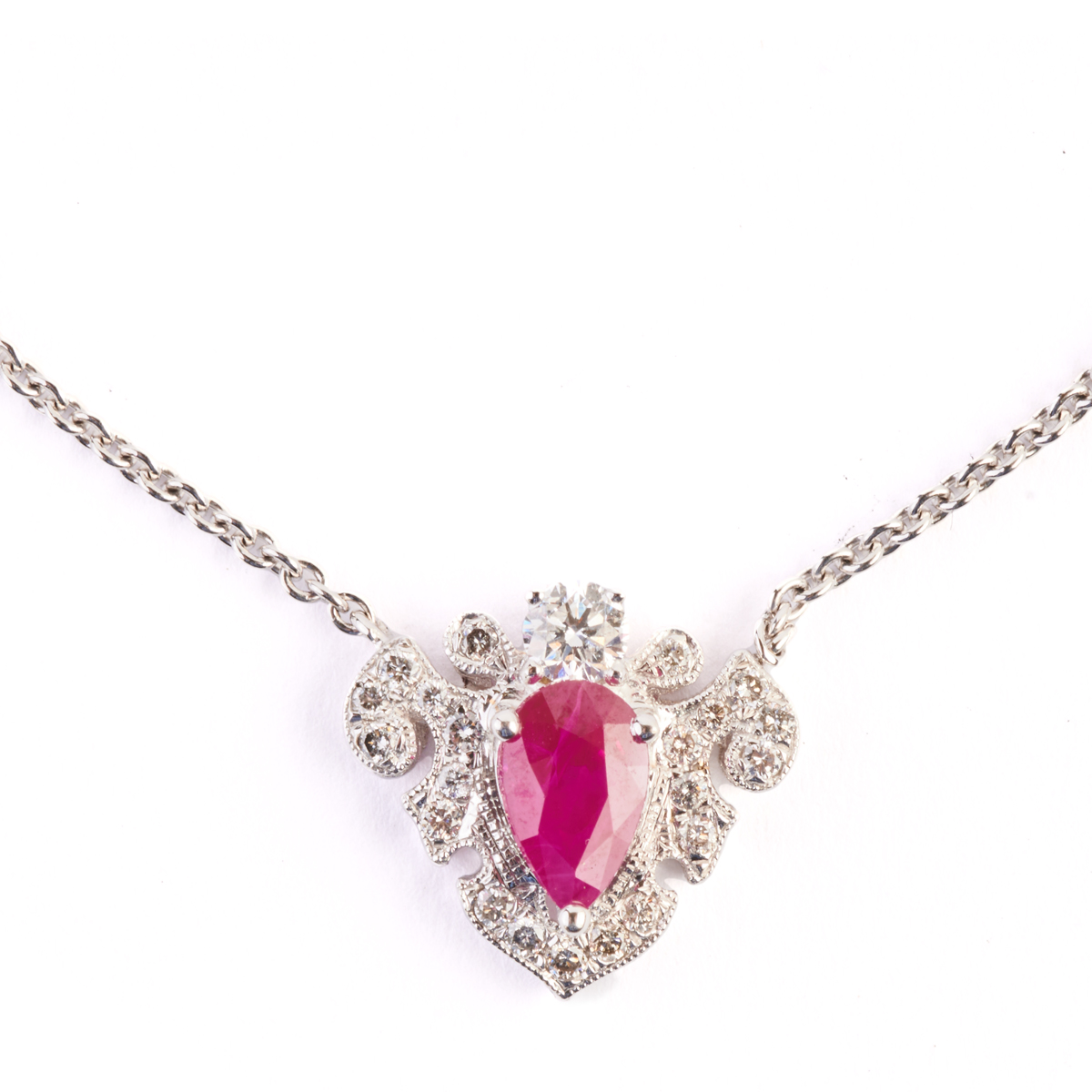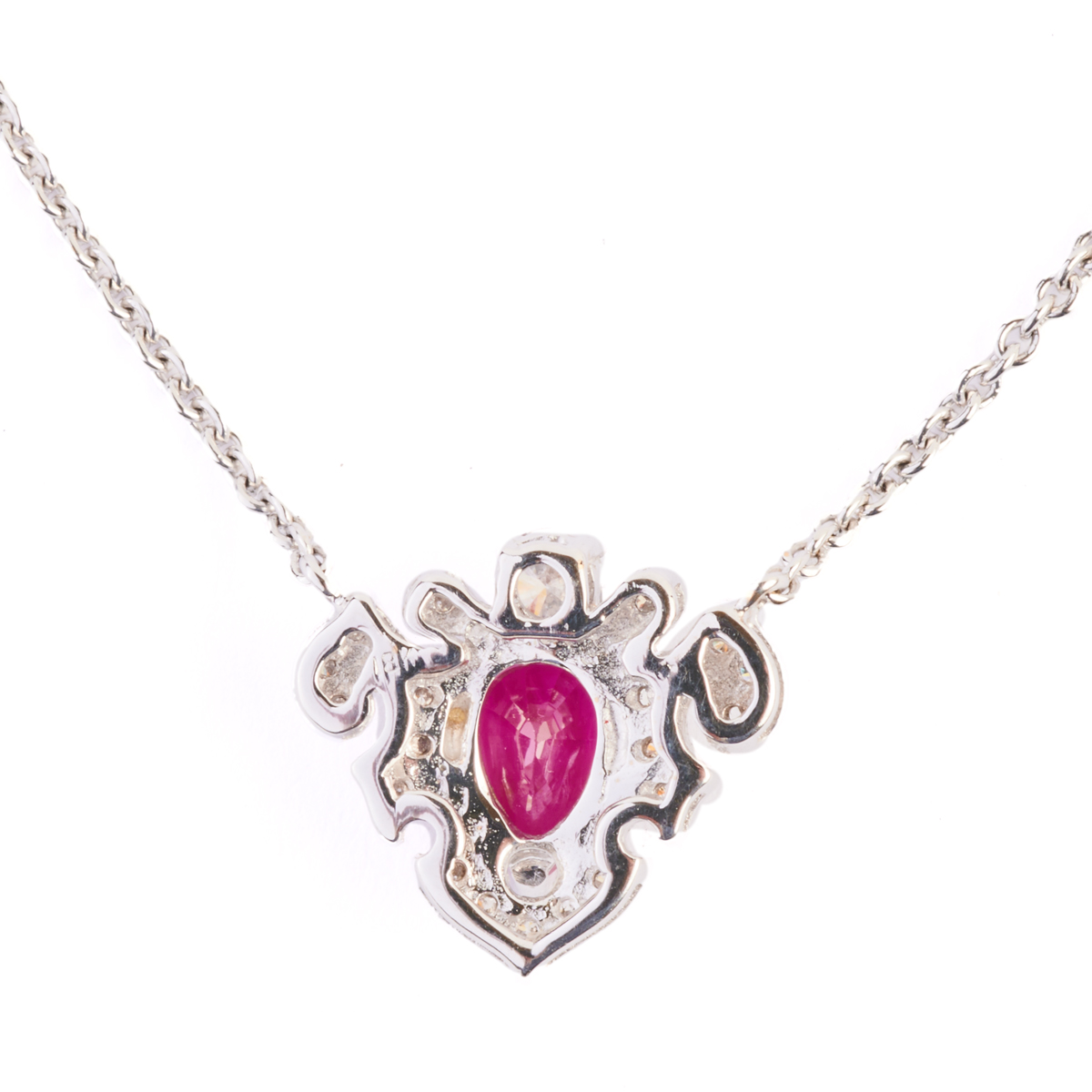 Featuring one pear-cut ruby weighing approximately 1.05 ct., accented by twenty-two full-cut diamonds weighing a total of approximately 0.40 cttw., set in an 18k white gold mounting measuring approximately 13 x 15 mm, suspended from an 18k white gold chain, completed by a spring ring clasp, forming an 18 inch necklace.