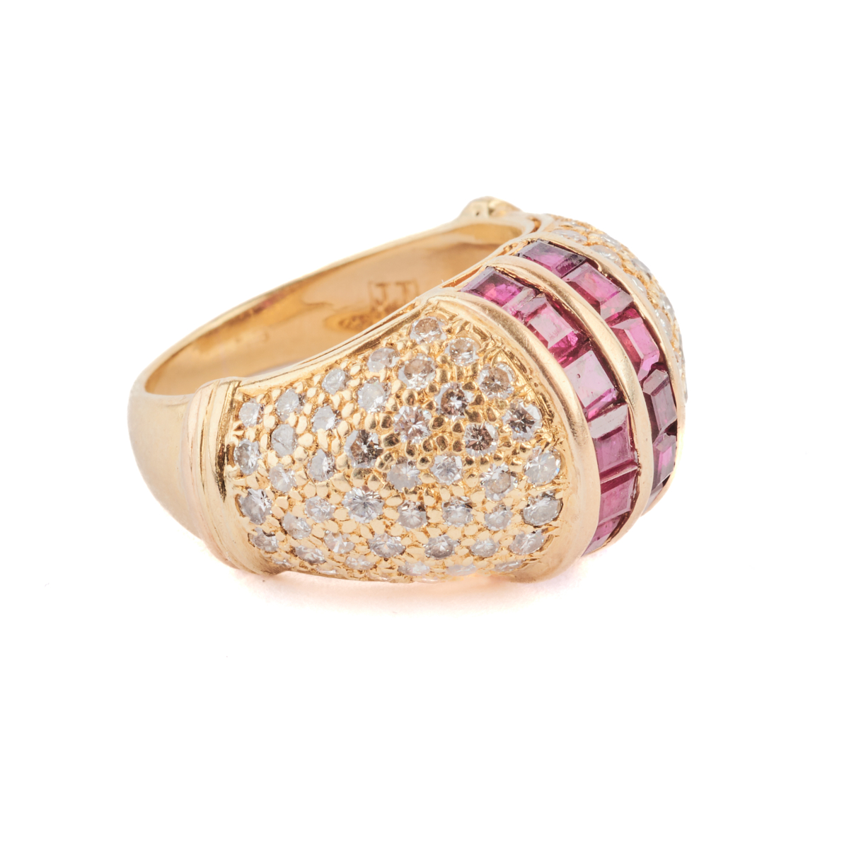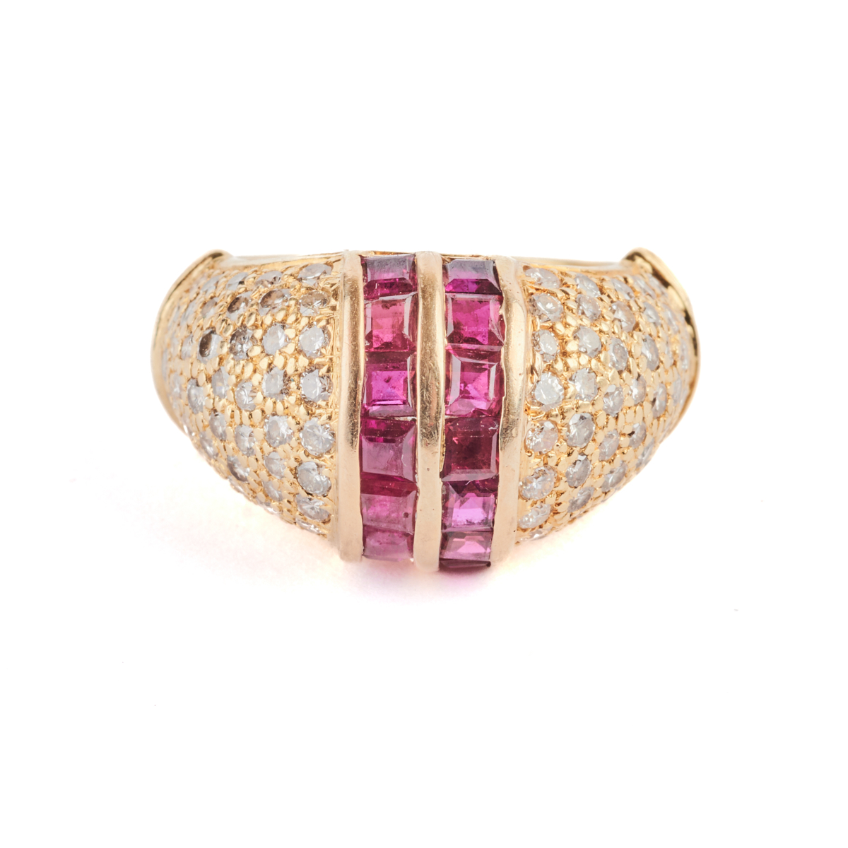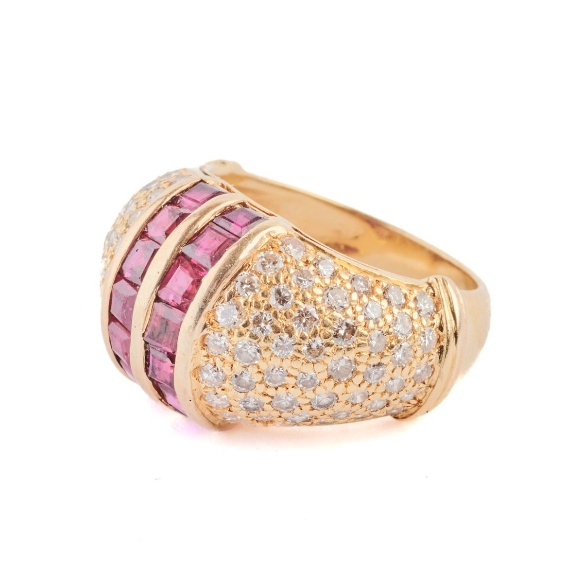 Featuring fourteen square-cut rubies in two rows, accented by full-cut diamonds weighing a total of approximately 1.50 cttw., set in an 18k yellow gold domed mounting measuring approximately 13 mm in width.