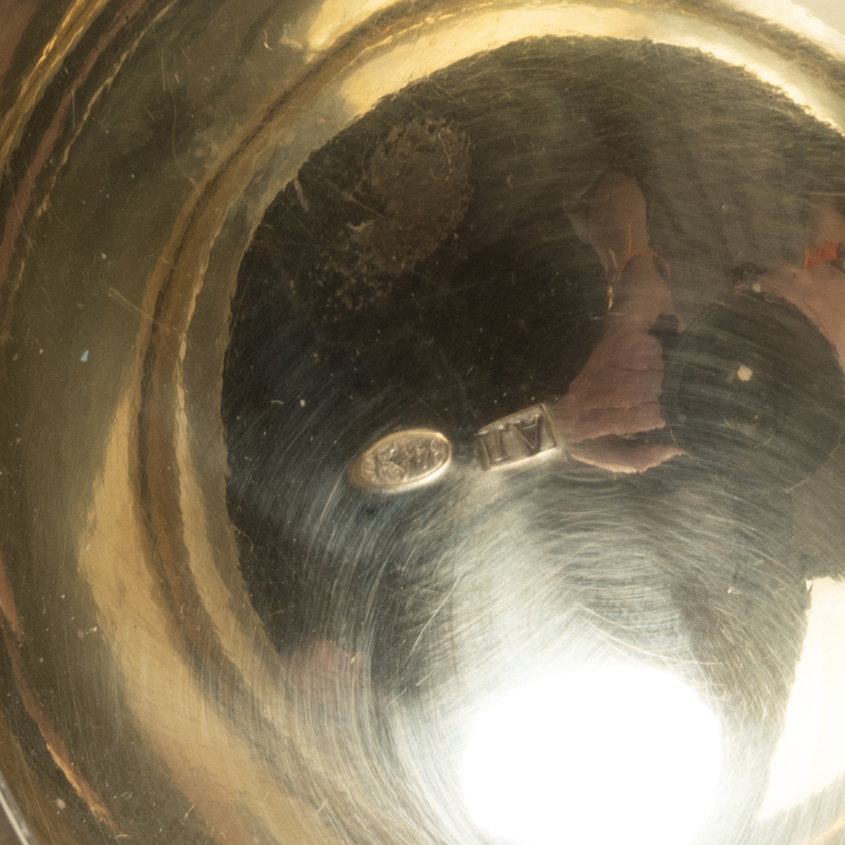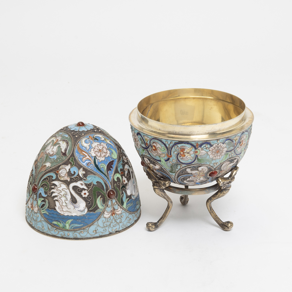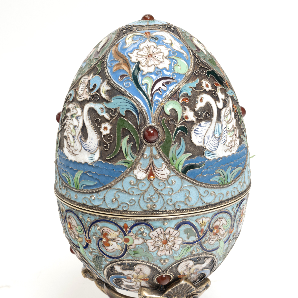 Vermeil silver egg form box with enamel and mounted with stones, decorated swans amongst floral and foliate motifs small tripod stand included.