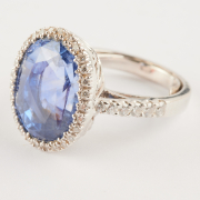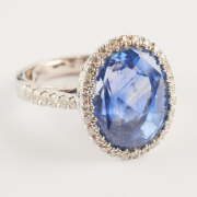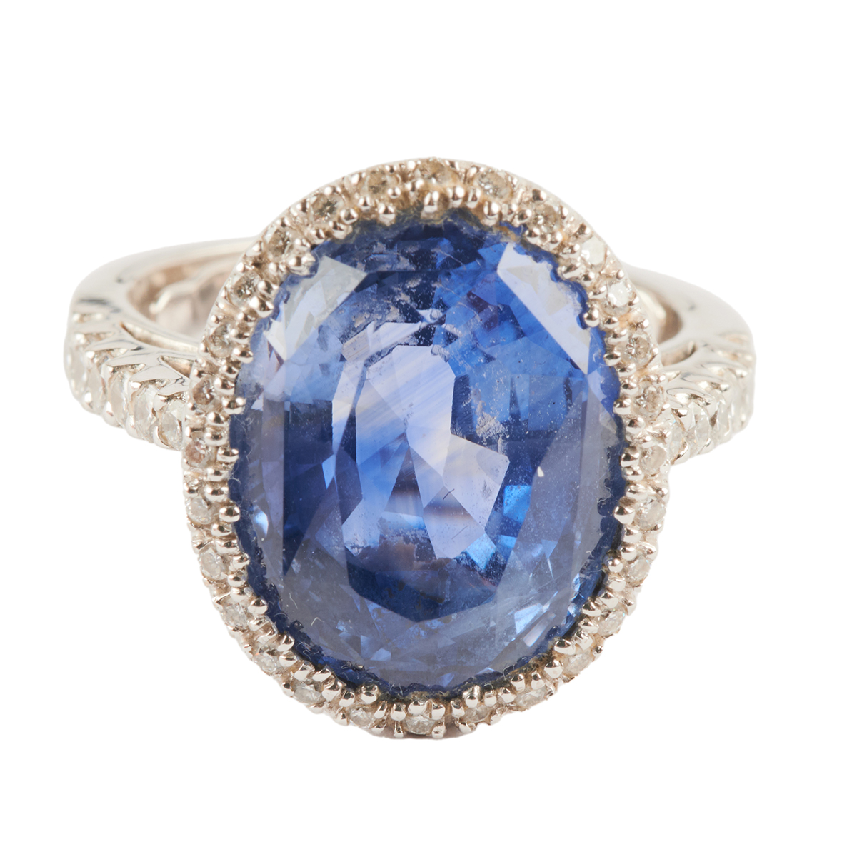 Featuring one oval-cut sapphire weighing approximately 13.25 cts., accented by forty full-cut diamonds weighing a total of approximately 0.50 cttw., set in an 18k white gold mounting.