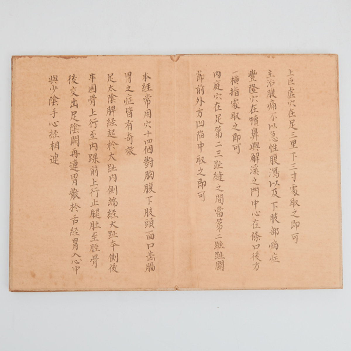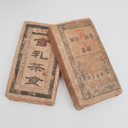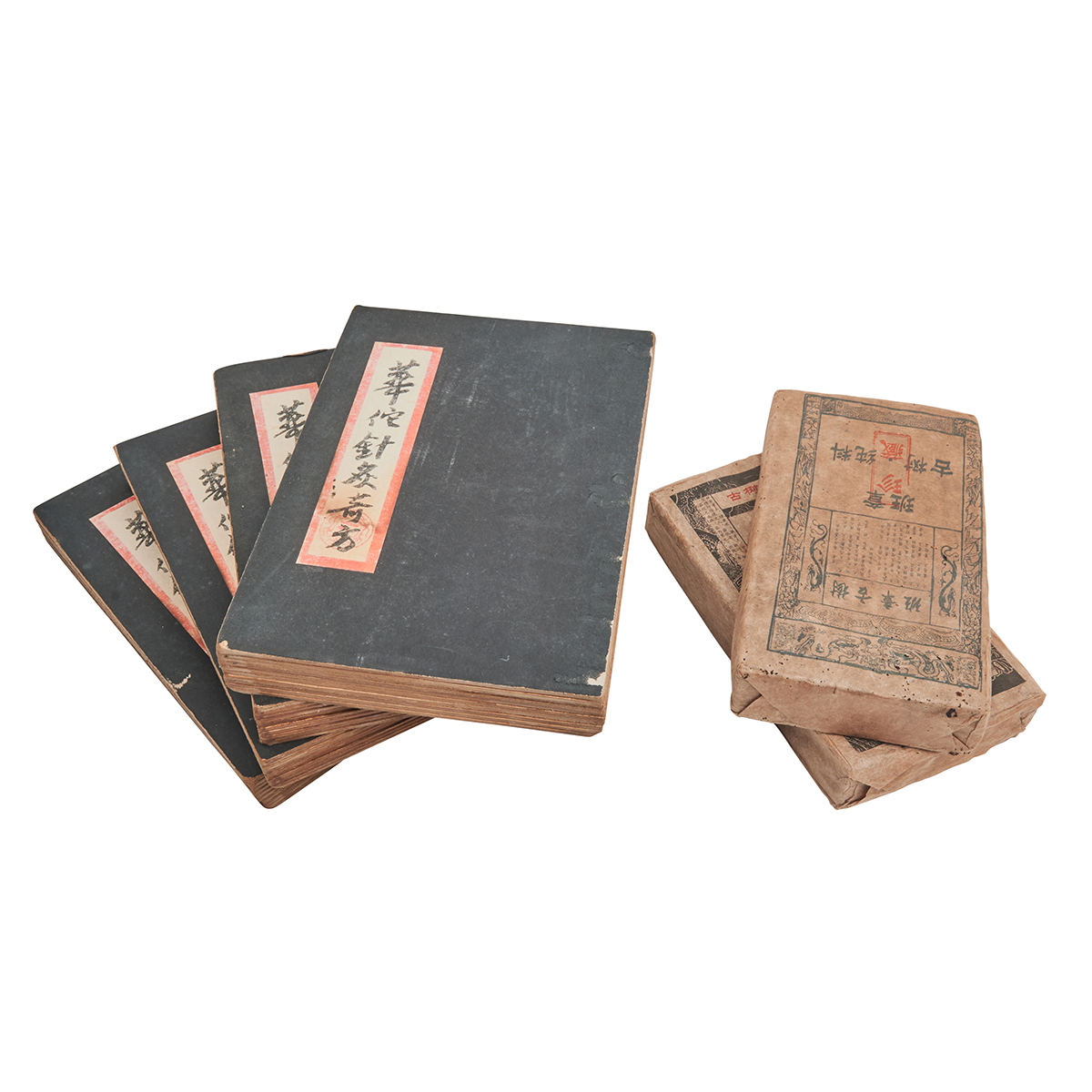 Comprising: four volumes of black covered Chinese traditional medicine books and two rectangular tea bricks wrapped with printed brown paper.