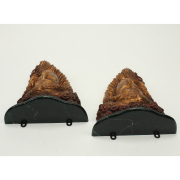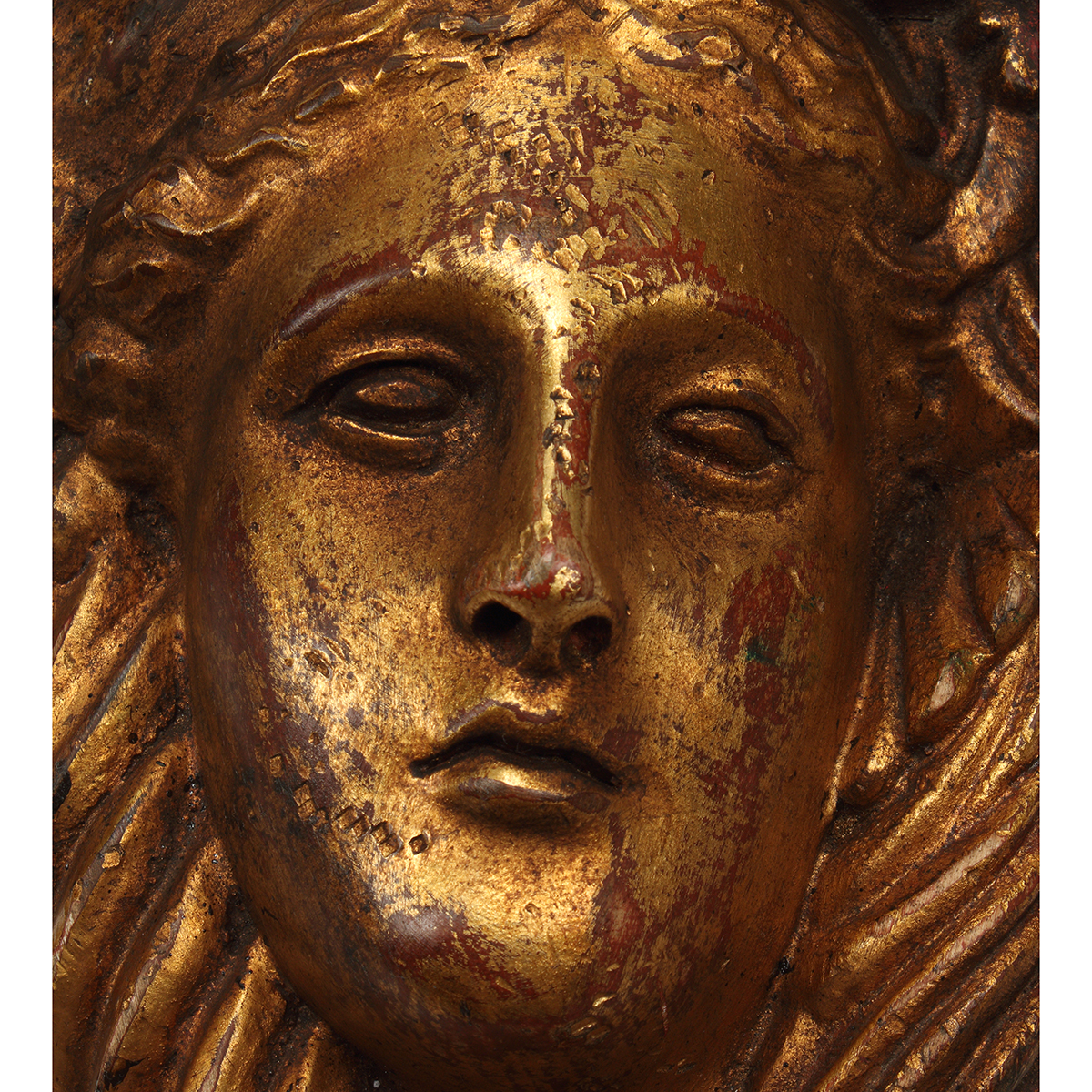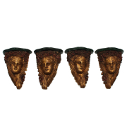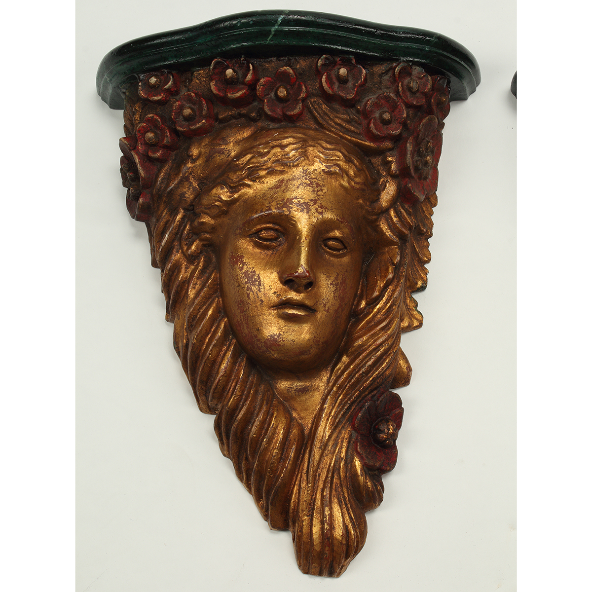 Giltwood female busts within red floral surround, green painted surface two with heads tilted right, the other two opposite.