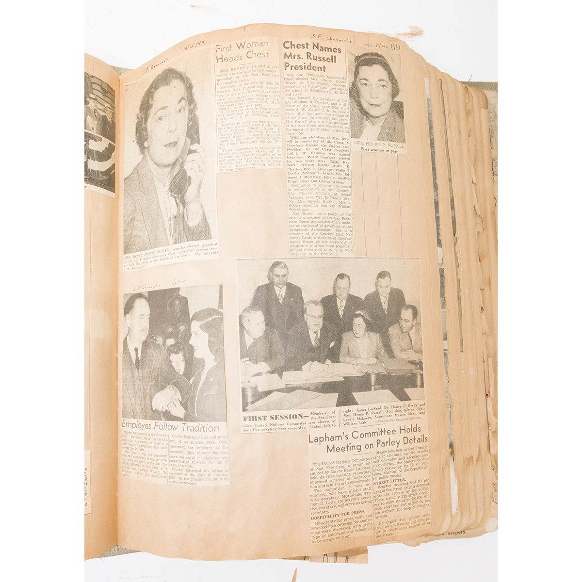 Comprising LAYING OF THE CORNERSTONE OF THE SAN FRANCISCO WAR MEMORIAL scrapbook five large scrapbooks on W.H. Crocker, Crocker family, and related news with various newspaper clippings and photos scrapbook on Crocker family with collection of Telegrams photo portraits of W.H. Crocker through the years estate photo and chapel photo.