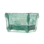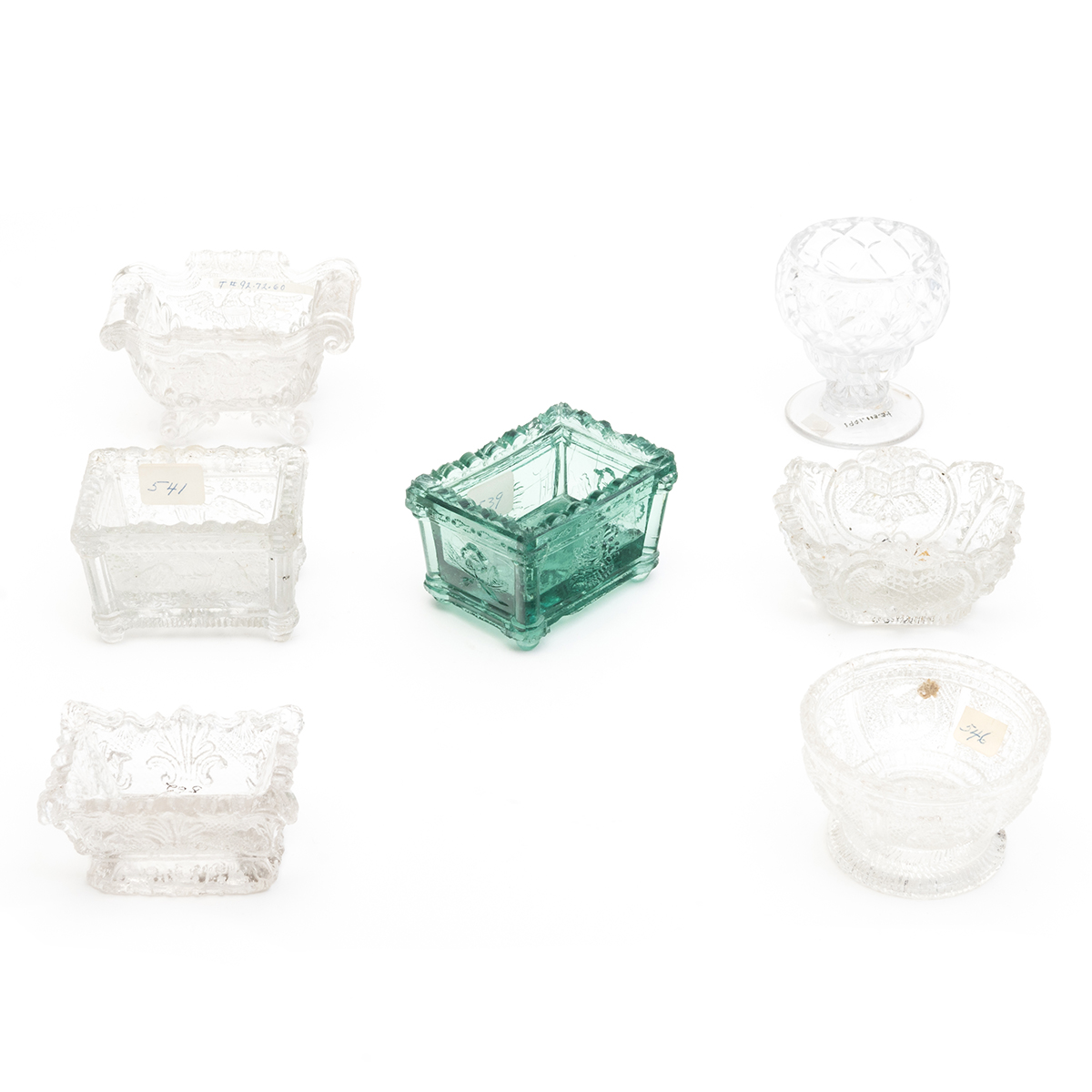 Five of pressed glass, including an EE-1a eagle, an EE-7, molded in the form of a Classical sofa, and with spread wing eagle to long sides an EE-8a eagle and ship round example, an OL-17A diamond star and scroll, an NE-4 and an NE-6 in pale green, and a Stiegel-type diamond footed master salt.