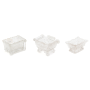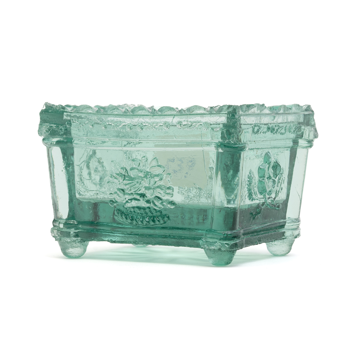 Condition: Three of the salts with chips to rims, and the pontil polished and partly broken off. Minor rough surfaces and the green example with cracks from the mold transferred to the interior surface.