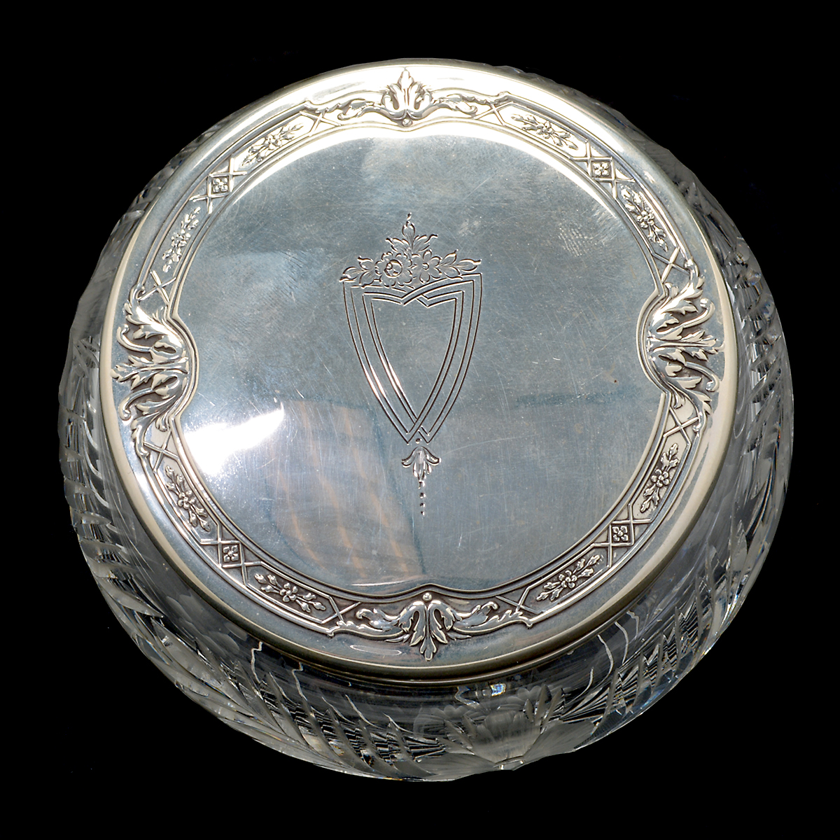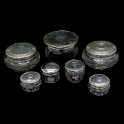 Various sizes, most glass with cut or etched decoration, and the lids with repousse and engraved decoration.