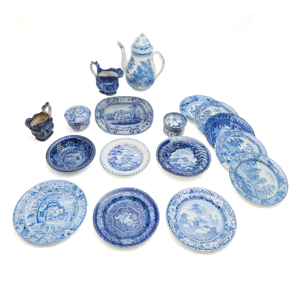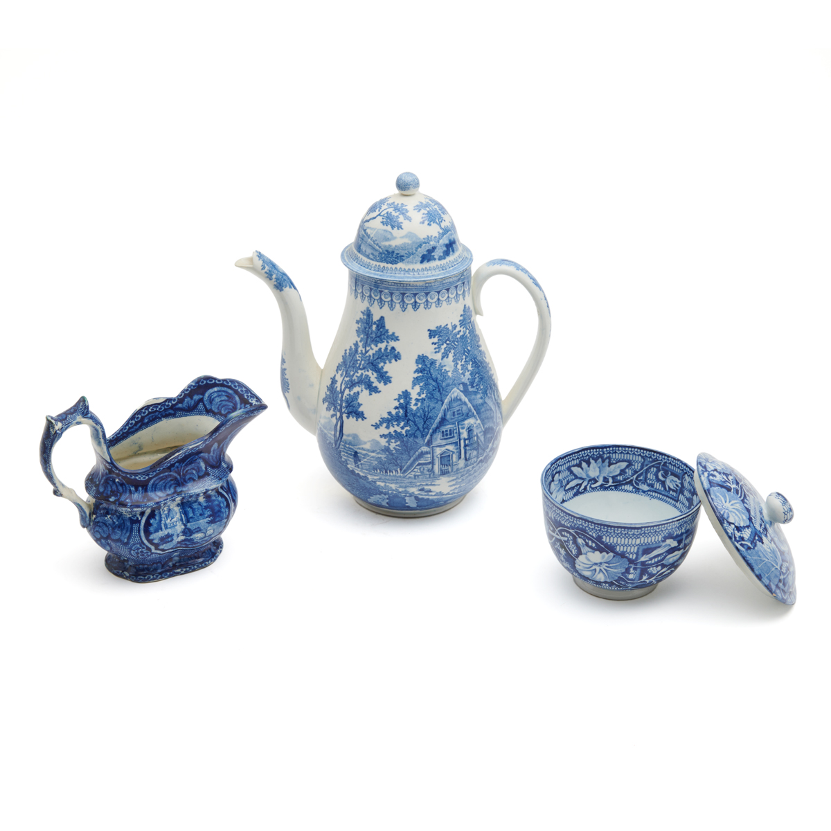 Pearlware and ironstone. Transfer printed in medium and dark blue in a variety of romantic, Chinoiserie, avian, British rural patterns including a coffee pot and cover, a sugar bowl and cover, a jam pot and cover, two creamers, a platter, a soup plate, a basket-woven plate, and various other plates.