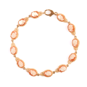 Featuring twelve oval shaped shell cameos measuring approximately 8 x 6 mm, set in a 14k yellow gold mounting, completed by a lobster claw clasp, forming a 7 1/2 inch bracelet.
