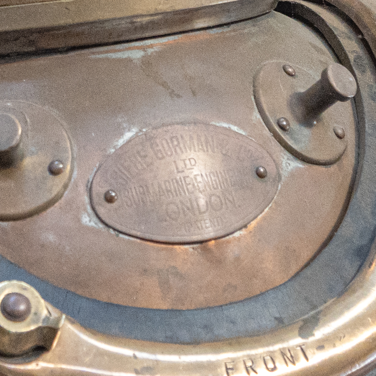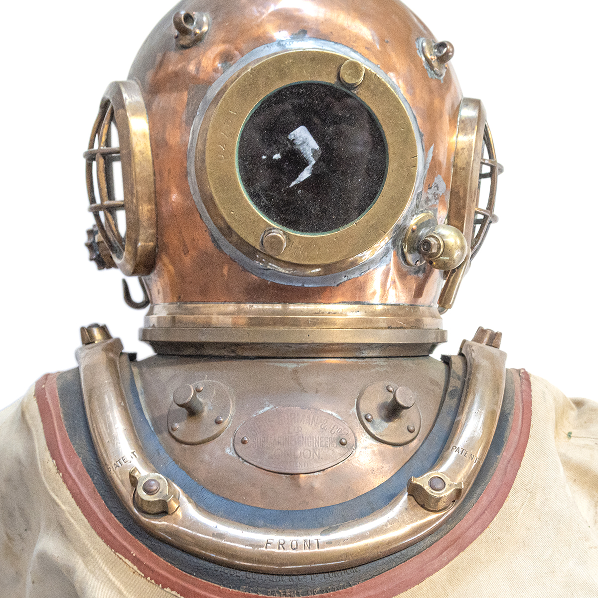 Helmet viewing window with serial 12770, helmet base with plaque reading SIEBE GORMAN CO LTD SUBMARINE ENGINEERS LONDON (PATENT), rubber collar with SIEBE GORMAN CO LONDON.
